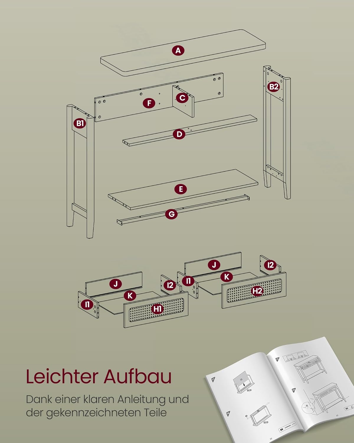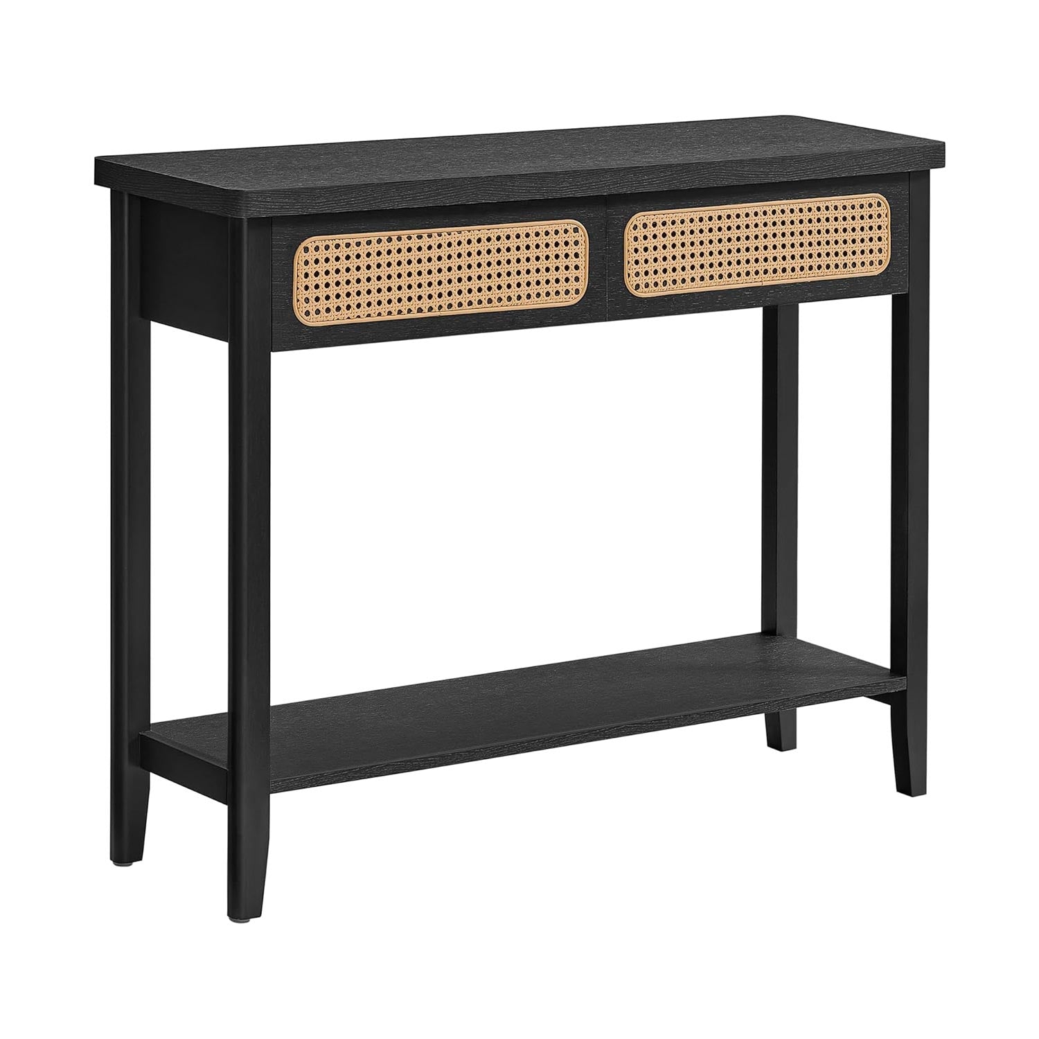Dette konsolbord er bygget til at holde. Fremstillet af højkvalitets spånplader, MDF-plader og plast-rattan, tilbyder bordet en robust struktur, der kan bære op til 100 kg. Den store bordplade er ideel til opbevaring af bøger, lamper, potteplanter eller duftlys, mens de 2 store skuffer skjuler småting og holder dit hjem organiseret. Den åbne hylde i bunden giver ekstra opbevaringsplads til sko eller kurve.