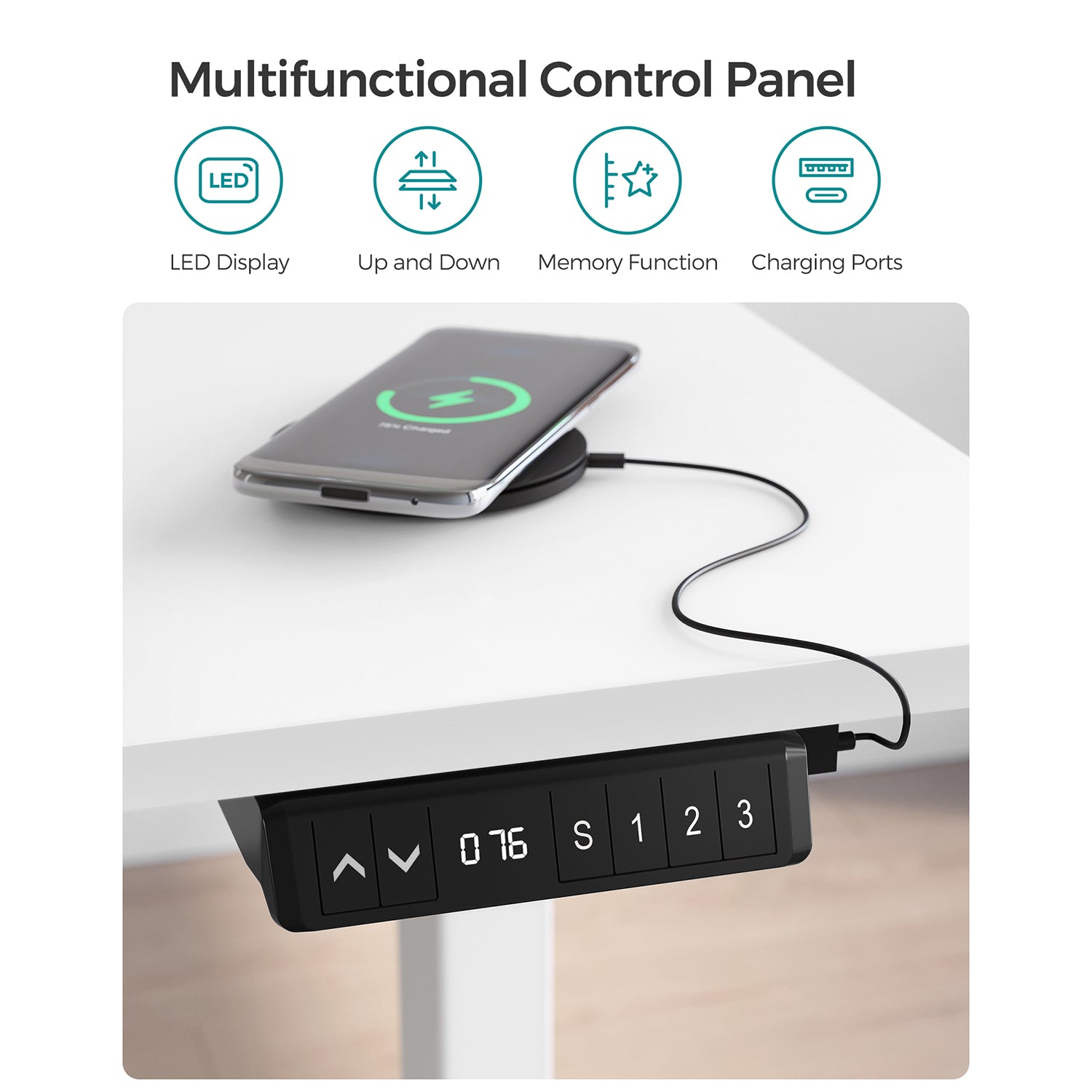 Skrivebordet har brugervenlige knapper til at gemme op til tre forskellige højder, hvilket giver hurtig adgang til dine præferencer. Med indbyggede USB- og TYPE-C-porte kan du nemt oplade dine enheder, mens du arbejder. Den højkvalitets motor sikrer en stille og blød justering af højden, med en justeringshastighed på 25 mm/s og et lydniveau under 50 dB, så du kan arbejde uforstyrret.