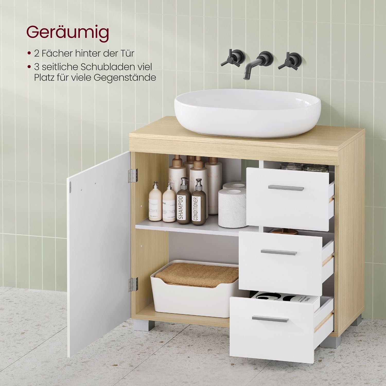 Dette smarte vaskeskab har 3 store skuffer og 2 rum bag en kabinetdør, perfekt til at opbevare badeartikler, håndklæder og mere. Hold dit badeværelse ryddeligt og organiseret med rigelig opbevaringsplads i et stilrent design.