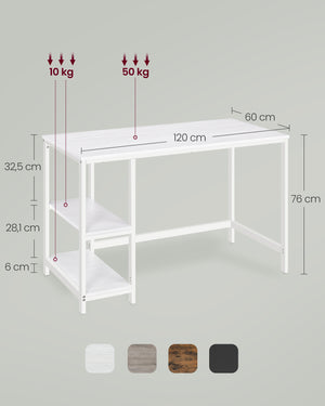 Dette skrivebord tilbyder fleksibilitet med sine 2 opbevaringshylder, hvor den ene er aftagelig og kan placeres til højre eller venstre alt efter dine behov. Den midterste hylde kan nemt fjernes, hvilket giver plads til en computer-tårn eller opbevaring af bøger, filer og andre ofte brugte genstande. Denne alsidighed sikrer, at dit skrivebord er både funktionelt og organiseret.