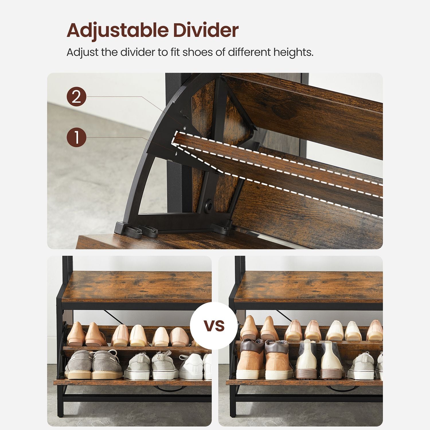 Skabt til at holde, har dette tøjstativ en stærk konstruktion af stål og spånplade, forstærket med V-stivere på bagsiden. Den robuste bænkskammel kan holde op til 100 kg, hvilket gør det nemt og komfortabelt at sidde og tage sko på. Kombinationen af vintage brunt spånplade og sort stålramme giver tøjstativet et industrielt design, der tilføjer karakter og stil til din entre. Dette design giver en unik atmosfære og passer perfekt ind i moderne boligindretning.