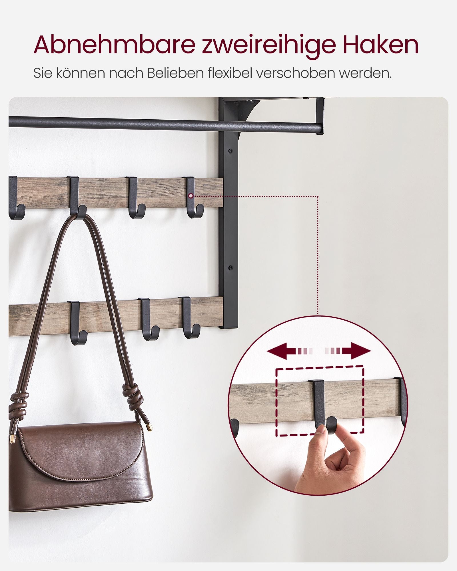 Tilpas opbevaringen efter dine behov med de 10 aftagelige kroge. De dobbeltrækkede kroge kan nemt justeres i forhold til den type beklædningsgenstande eller tasker, du ønsker at hænge op. Den robuste tøjstang giver yderligere opbevaringsplads, mens den øverste hylde er ideel til opbevaring af dekorative genstande, hatte eller nøgler. Denne fleksible knagerække gør det nemt at holde orden i entréen eller garderoben.