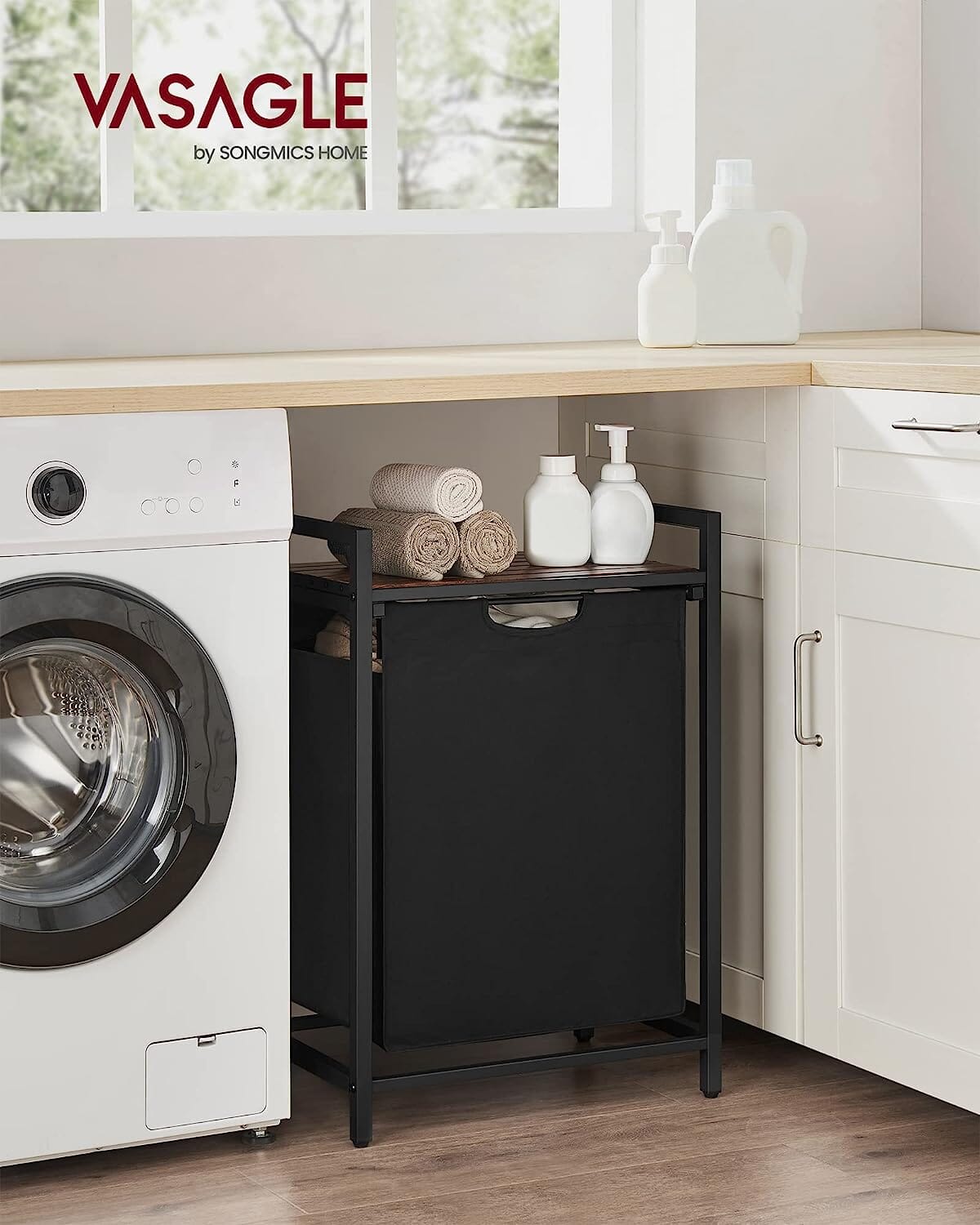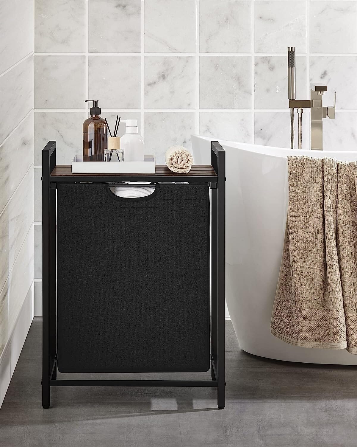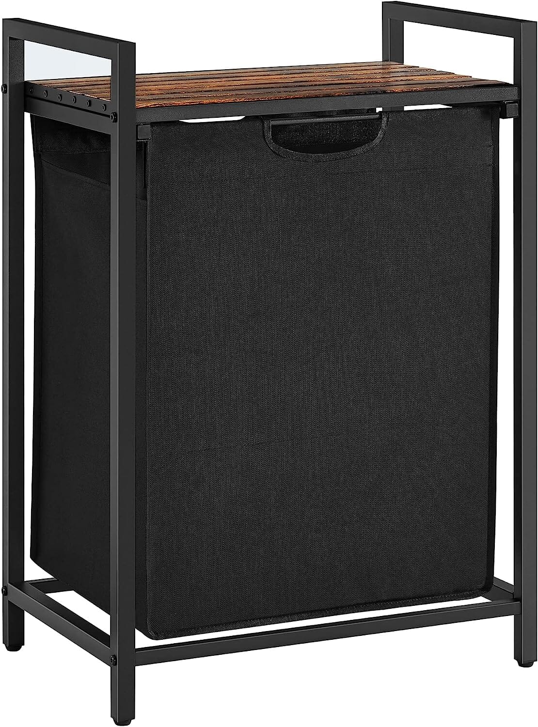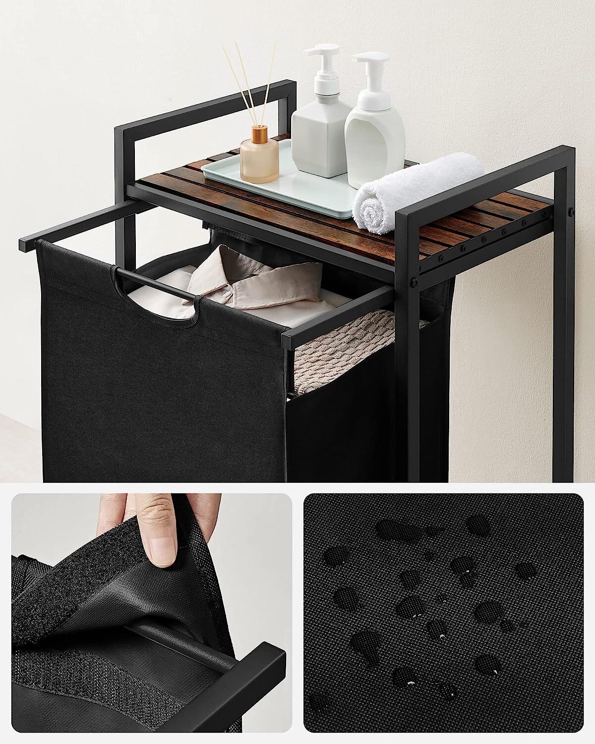 Skab et praktisk og stilfuldt vaskerum med denne flotte vaskekurv med en rustik topplade. Kurvene er designet med en sort stof, der gør dem holdbare og lette at rengøre. Kurven er også aftagelige og kan rumme op til 65 liter indhold. Den rustikke topplade er perfekt til at holde dine vaskemidler eller dekorative elementer, da den kan holde op til 20 kg.