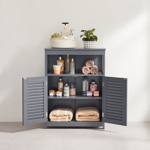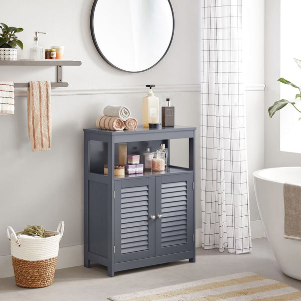 Dette badeværelsesskab kombinerer en mat grå finish, stilfulde skodder og et simpelt, men elegant design. Skabet tilføjer en beroligende stemning til både dine bade- og morgenrutiner, og det passer perfekt ind i moderne hjem, hvor både stil og funktionalitet er vigtige.