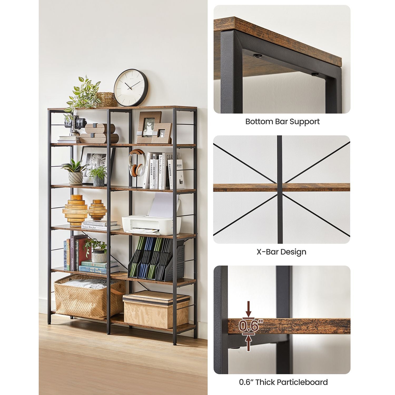 Reolen er lavet af træspånplader og stål med en X-stang på bagsiden for ekstra stabilitet. Med justerbare fødder og et vægmonteret tiltbeslag er denne reol designet til at stå fast på alle gulve.