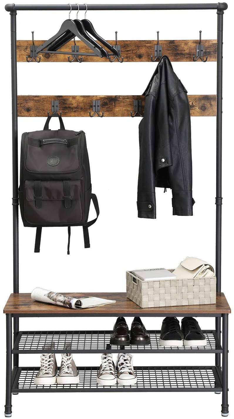 Robust og urbant design - Lionel-garderobestativ er en stilfuld og praktisk måde at opbevare tøj, hatte og sko på. Den er lavet med en metalramme, spånplade og laminatoverflade i mørkebrun træfarve. Benene kan justeres for at gøre stativet stabilt.