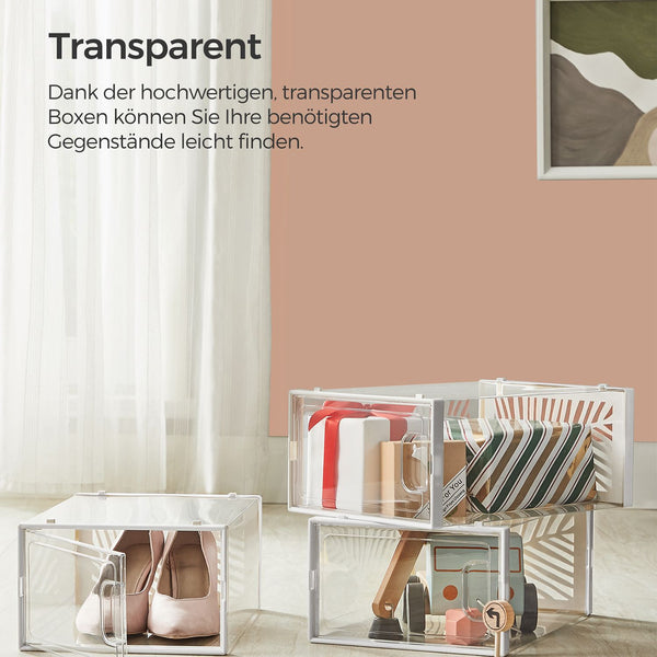 Med PET- og ABS-materialer er disse bokse stabile ved stabling og pladsbesparende. Perfekt til garderoben, soveværelset og entréen.
