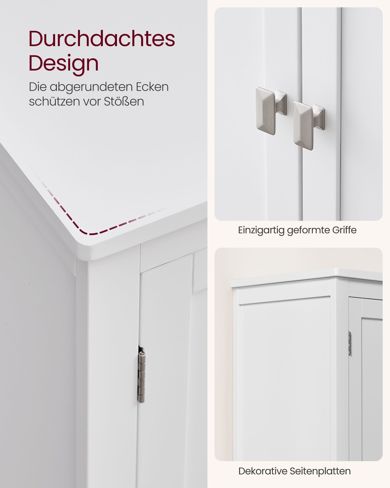 Dette gulvskab er ikke kun praktisk, men også elegant. Fremstillet af høj-kvalitets MDF, er det både holdbart og stabilt. De dekorative paneler tilføjer et stilfuldt touch til dit badeværelse, mens afrundede hjørner og et medfølgende anti-tip kit sikrer, at skabet både er sikkert og børnevenligt. Dette gulvskab giver dig ikke kun en praktisk opbevaringsløsning, men også et smukt møbel, der løfter hele rummet.