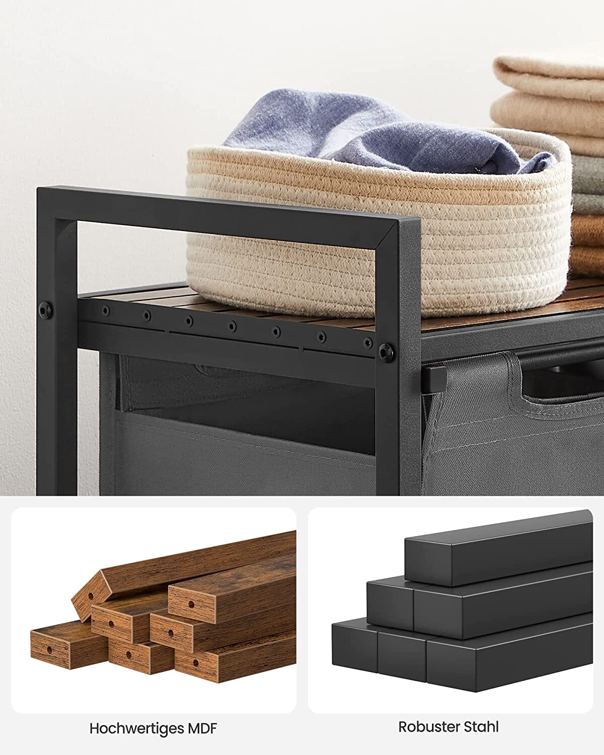 - Materiale: MDF, Stål, Oxford stof