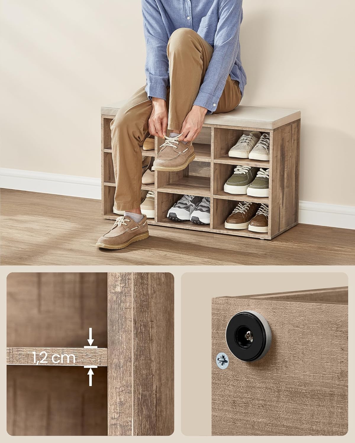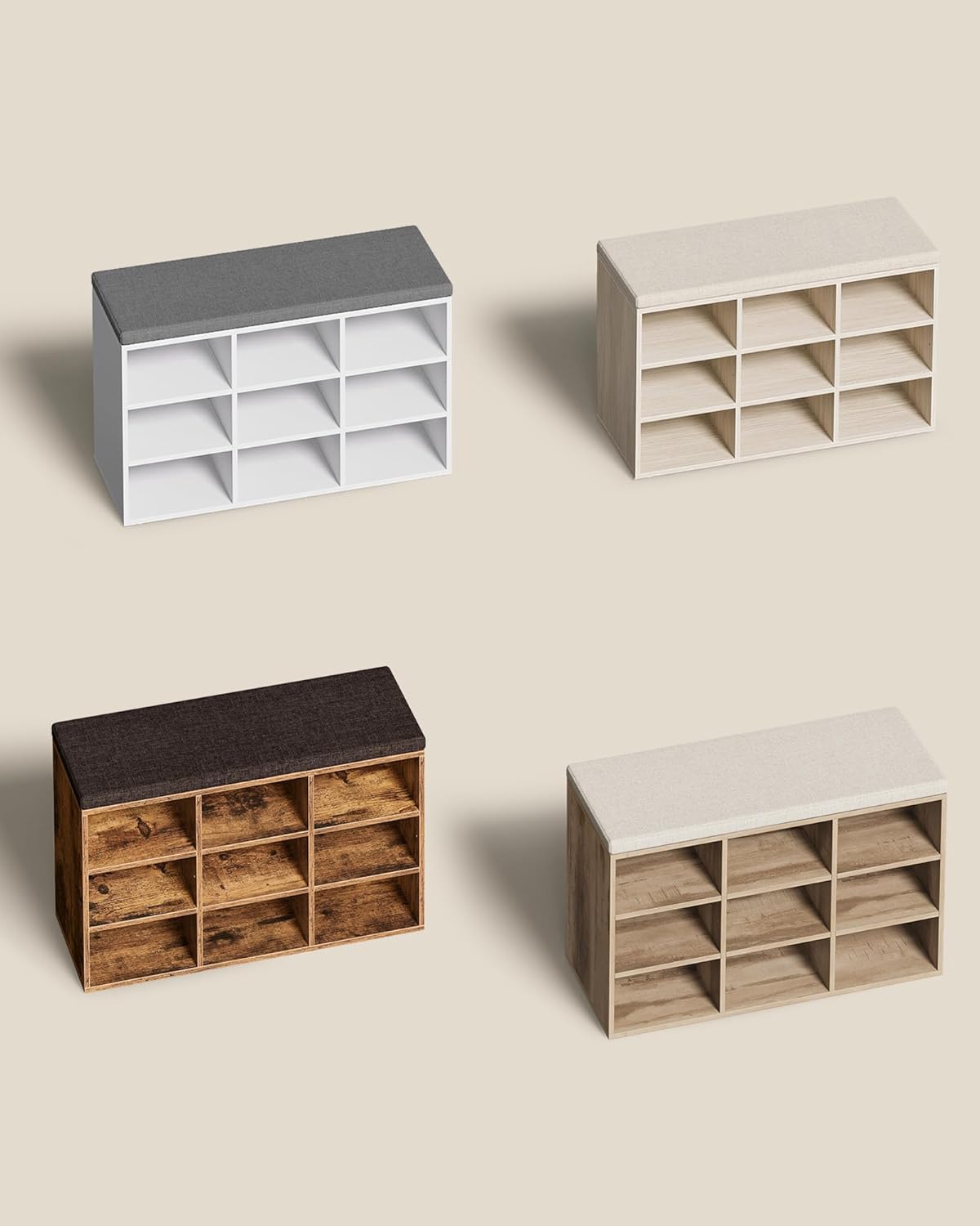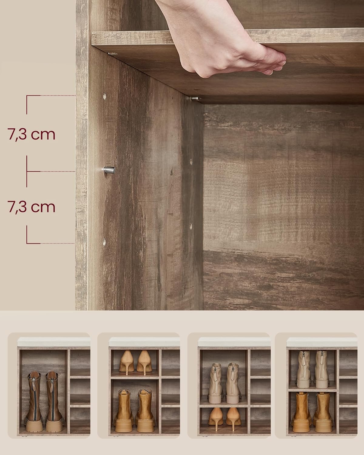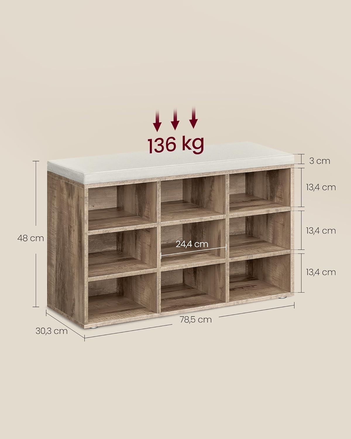 Dette senge- og sidebord er designet til at holde dine sko og småting perfekt organiseret. Med 9 rummelige rum, hver måler 29,7 x 24,5 cm, kan du nemt opbevare op til 9 par sko. De justerbare og aftagelige skillevægge på siderne giver dig fleksibiliteten til at tilpasse opbevaringspladsen, så den passer til alt fra støvler til opbevaringskurve. Dette bord er den ideelle løsning til at skabe orden i dit hjem og tilføje et stilfuldt element til din entré, stue eller soveværelse.