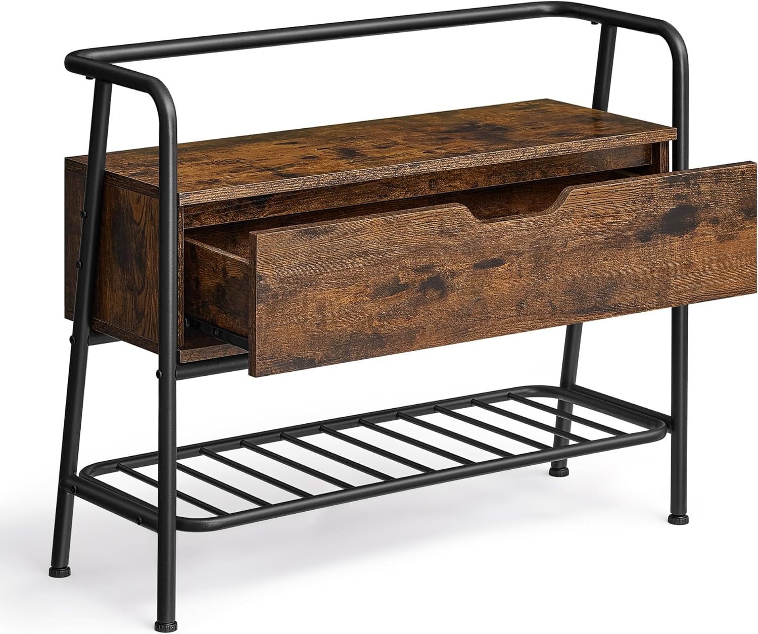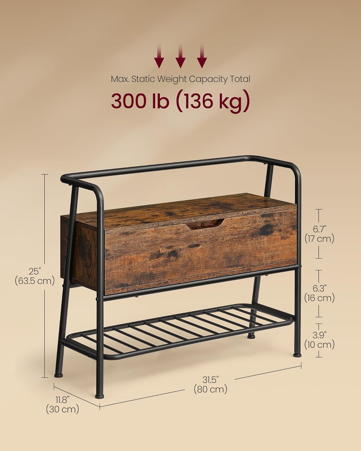 Denne opbevaringsbænk er lavet af spånplade og stål, der kan bære op til 136 kg. Den er perfekt som skobænk i entreen, som praktisk opbevaring i stuen, eller som en dekorativ bænk i soveværelset.