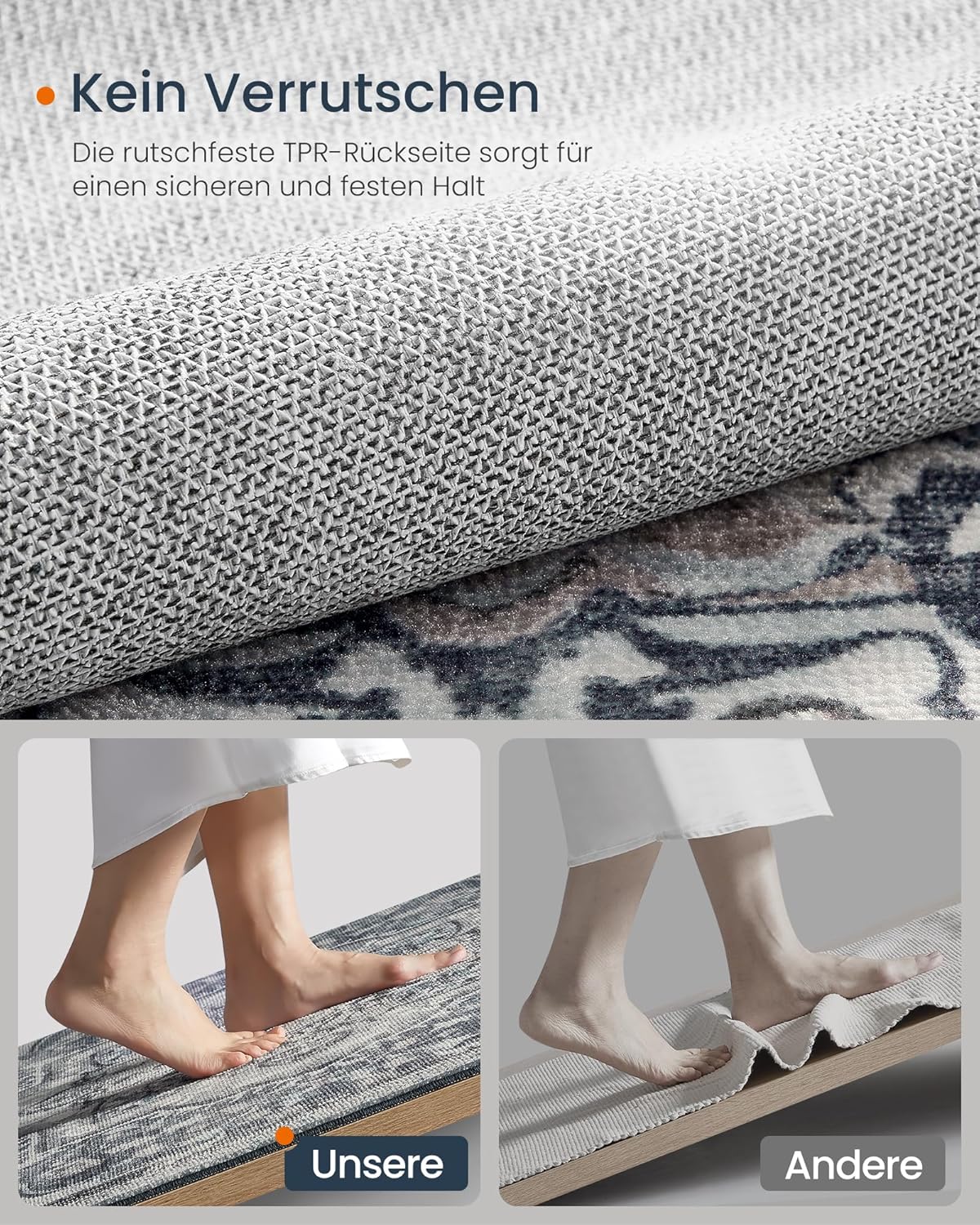Bagsiden af tæppet er fremstillet af TPR, hvilket sikrer fremragende skridsikkerhed, så det forbliver sikkert på plads på forskellige gulvtyper, herunder trægulve og fliser. Denne alsidighed gør tæppet til en perfekt tilføjelse til alle rum, hvor du ønsker at forbedre både komfort og sikkerhed.