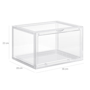 Er du en skoblærer, der værdsætter både stil og funktion? Vores klare skoæsker er designet til at fremvise dine yndlingssko på en elegant måde. Med en gennemsigtig krop kan du beundre dine sneakers, højhælede sko og designerstykker uden at åbne æskerne. Det klare materiale sikrer, at hver detalje af dine skoe er synlig og præsenteret på bedste vis.