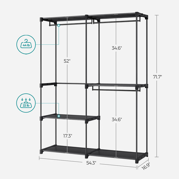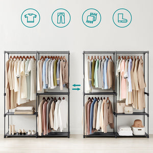 Har du brug for en bedre løsning til at holde styr på dit tøj? Dette tøjstativ tilbyder en rummelig garderobe med tre opbevaringssektioner, herunder to korte og én høj (op til 132 cm). Uanset om du har mange korte jakker eller lange kjoler, giver tøjstativet dig mulighed for at organisere dit tøj effektivt. Med tre hylder til opbevaring af tasker, hatte og strømper får du alt på sin rette plads, så du altid kan finde, hvad du leder efter.