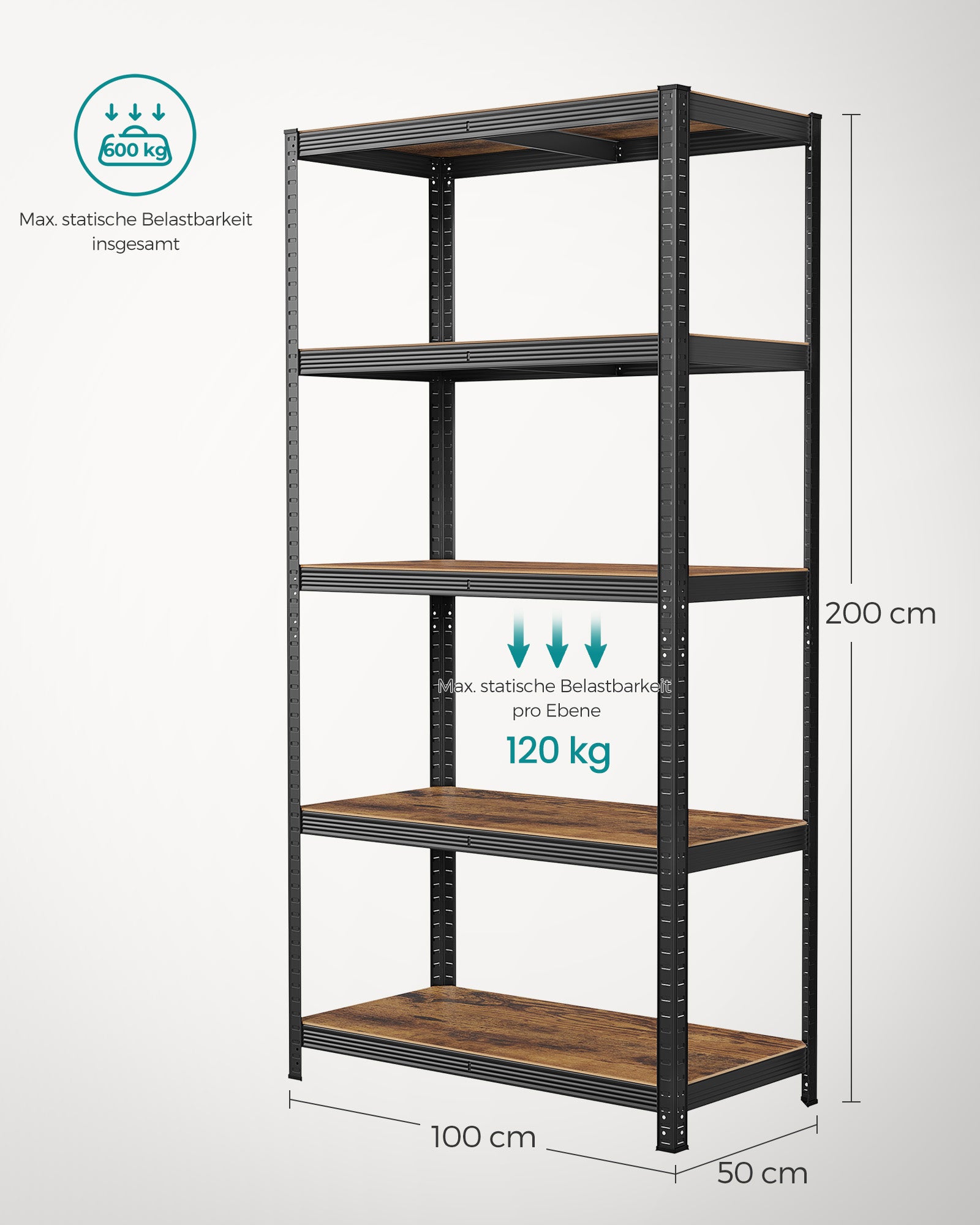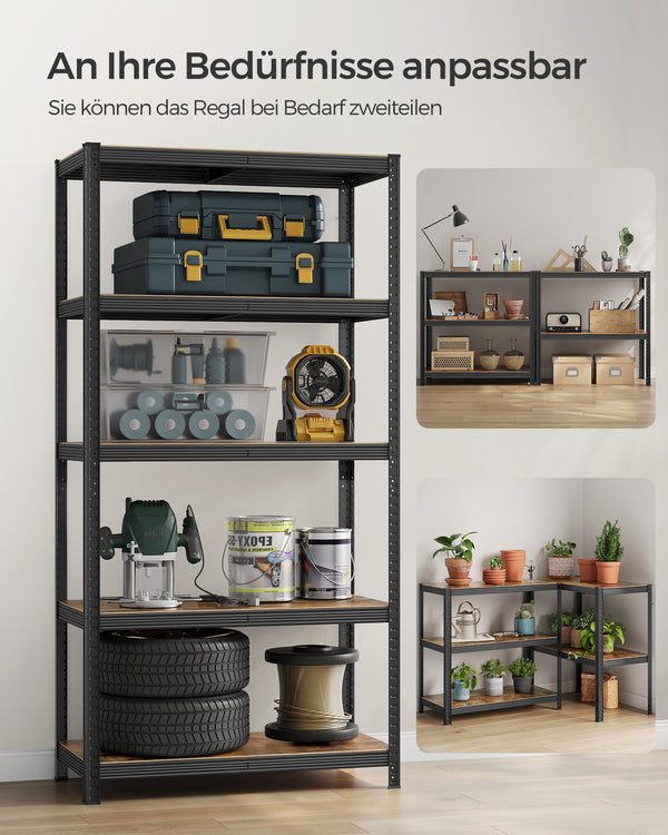 Denne værkstedsreol har en solid konstruktion af spånplade, der støttes af en stålramme med ekstra forstærkningsstænger. Hver hylde kan bære op til 175 kg, hvilket gør den sikker til opbevaring af malinger, værktøj og fitnessudstyr.