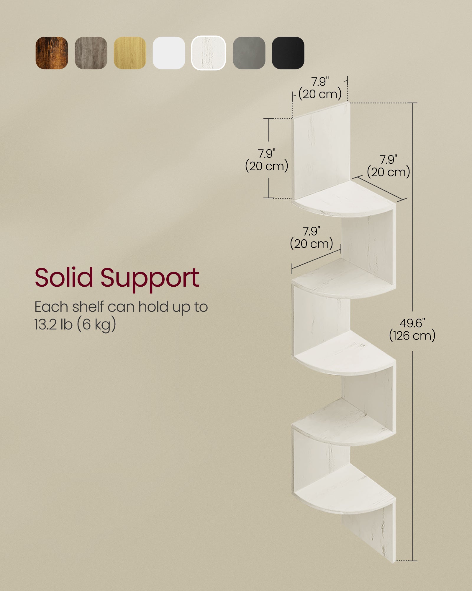 Afstanden mellem 2 hylder er 20 cm, hvilket giver perfekt plads til planter og andre småting. Størrelsen 20 x 20 x 126 cm giver dig mulighed for at udnytte hjørnepladsen fuldt ud i små rum.