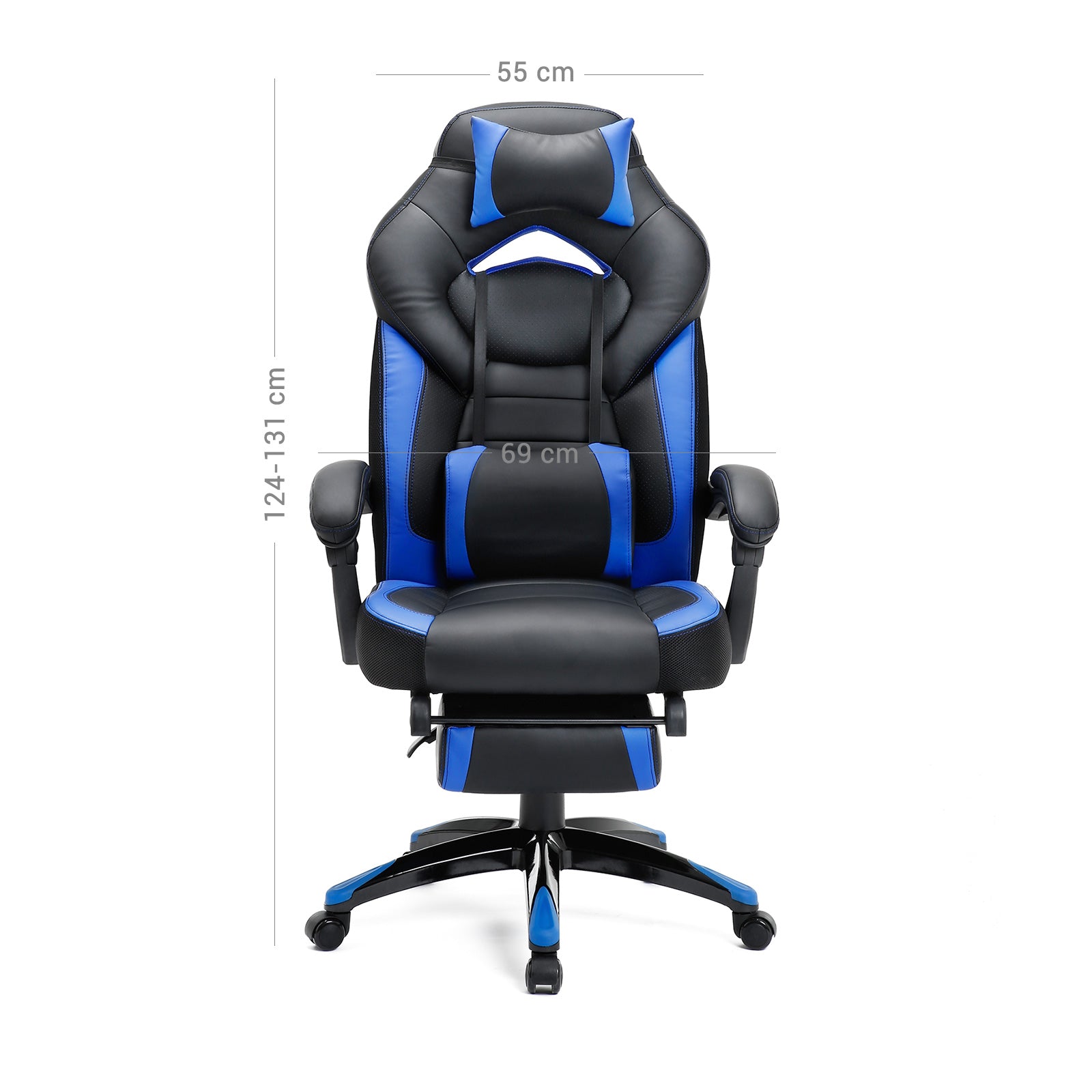 Denne gamingstol bærer op til 150 kg og har forstærkede armlæn, åndbart mesh, syntetisk læder og en vippet fodstøtte for ekstra komfort. Alt er designet for optimal holdbarhed og komfort.