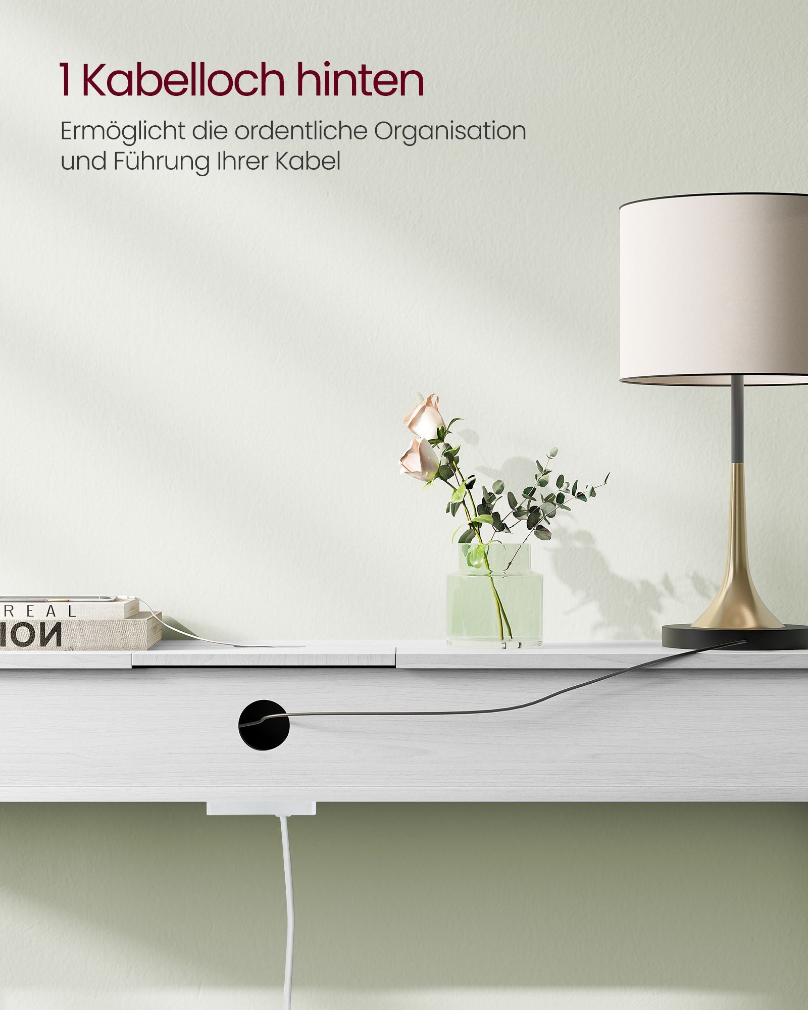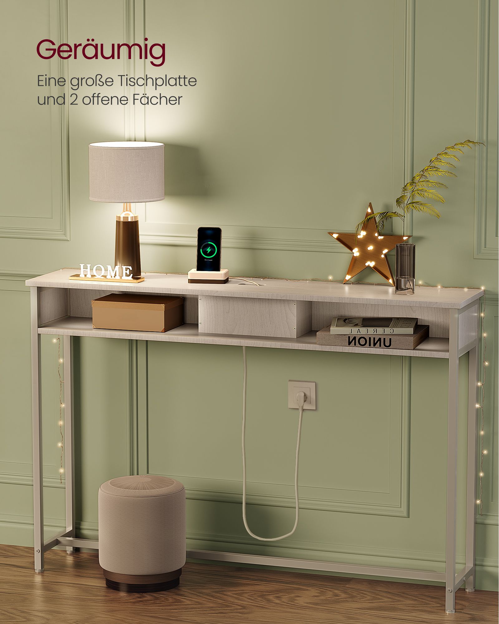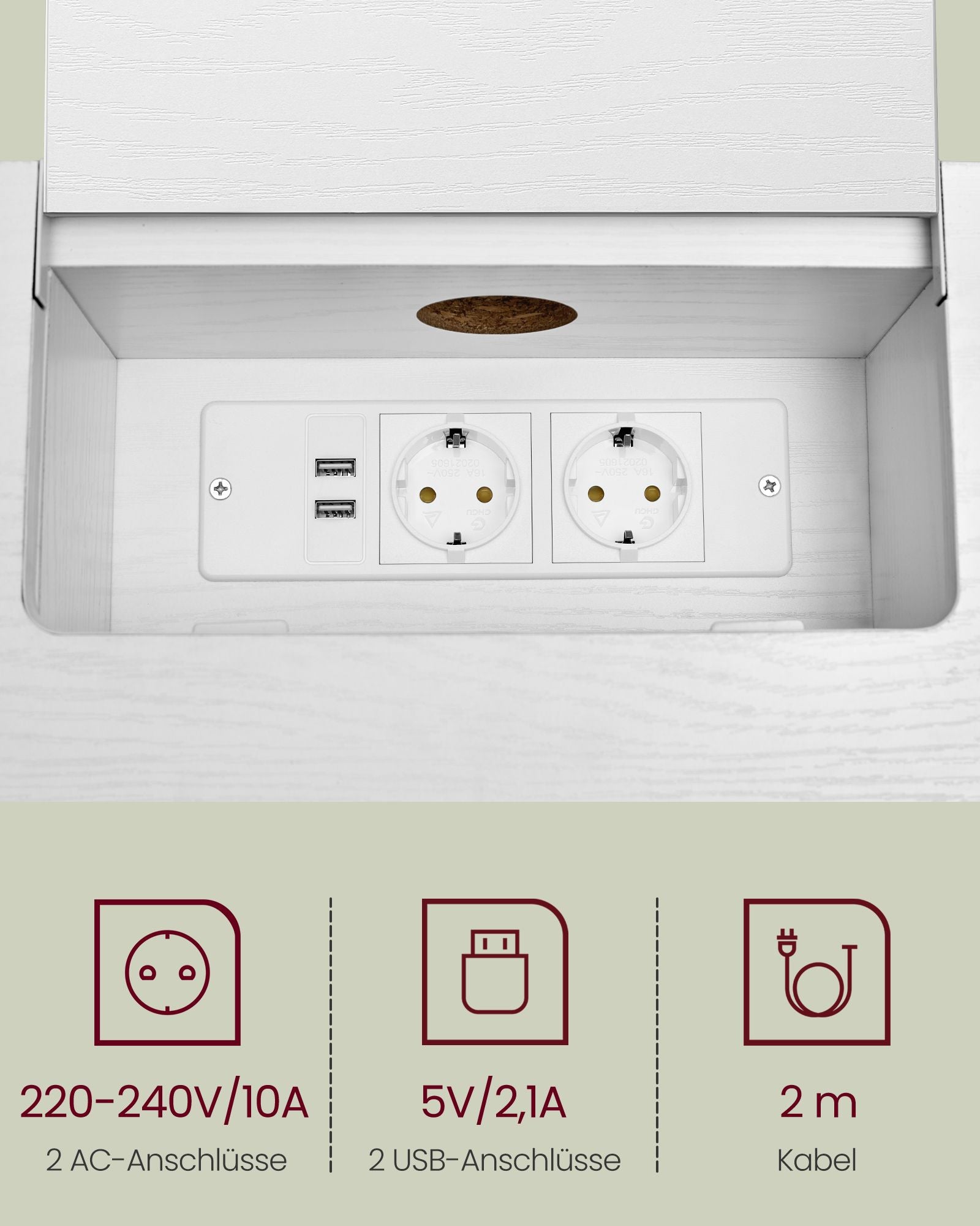 Dette smalle konsolbord er perfekt til opladning af dine enheder. Med 2 AC-udtag og 2 USB-porte kan du oplade lamper, telefoner, tablets og mere – alt på én gang og uden kabelrod takket være den skjulte strømskinne og kabelhul på bagsiden.