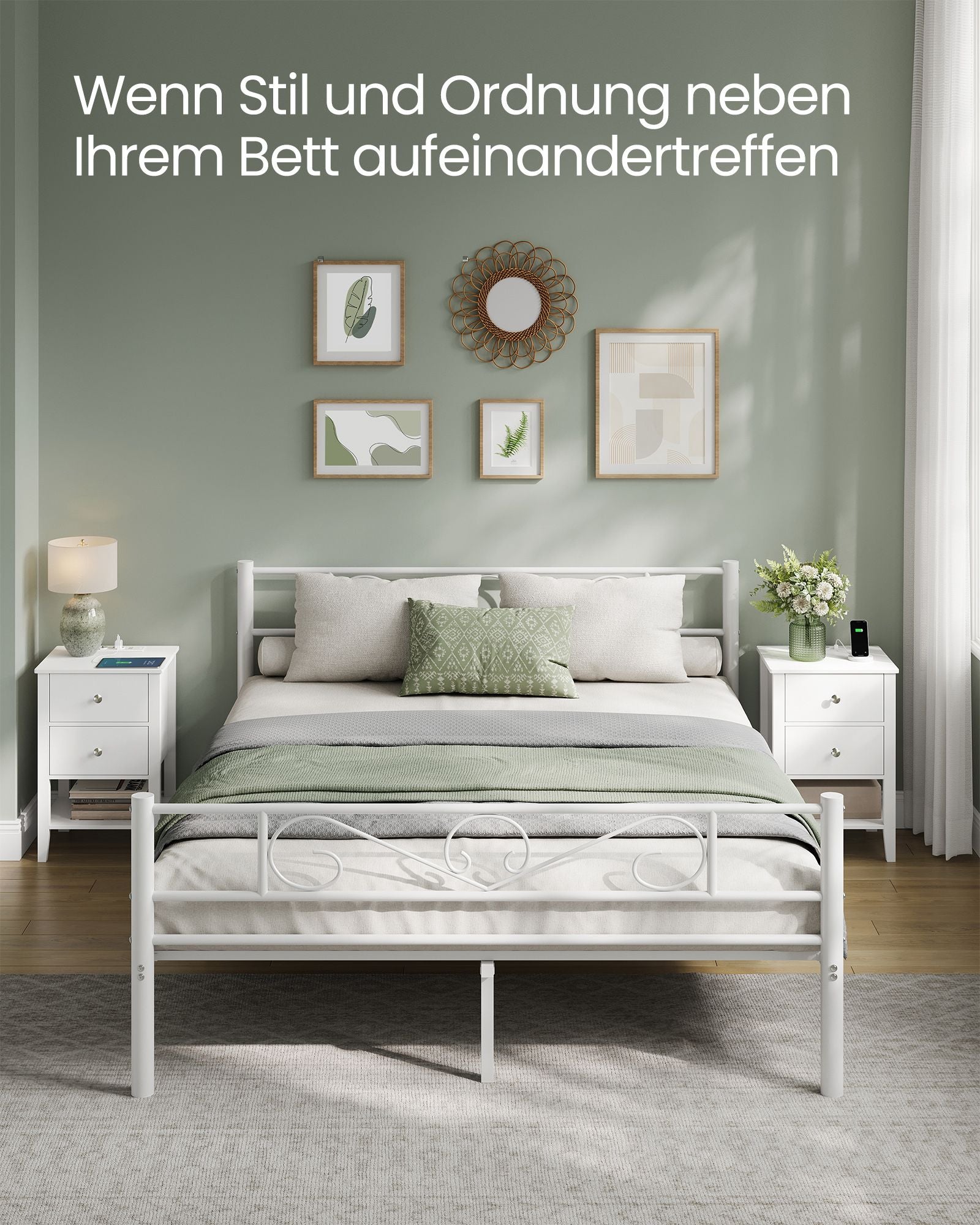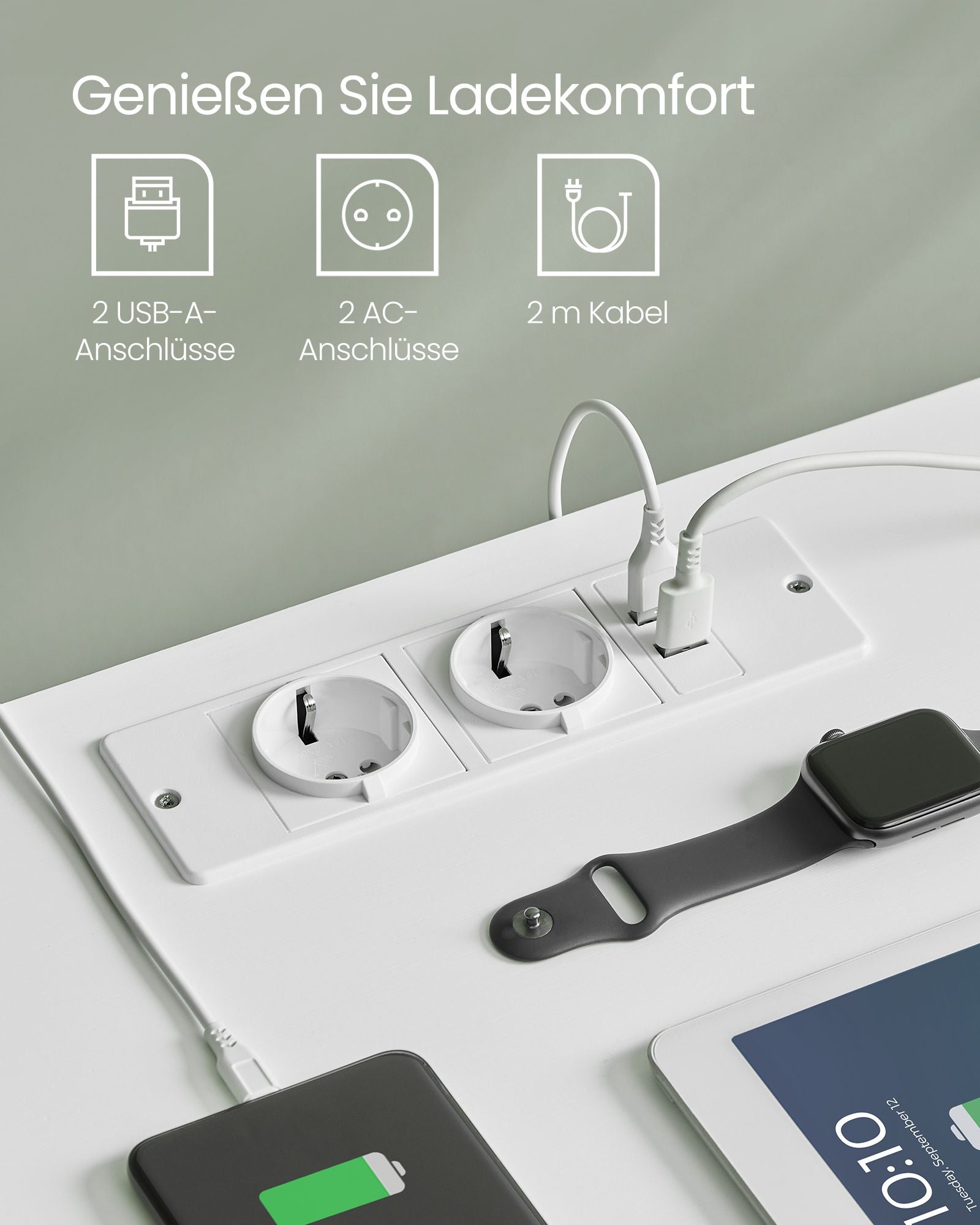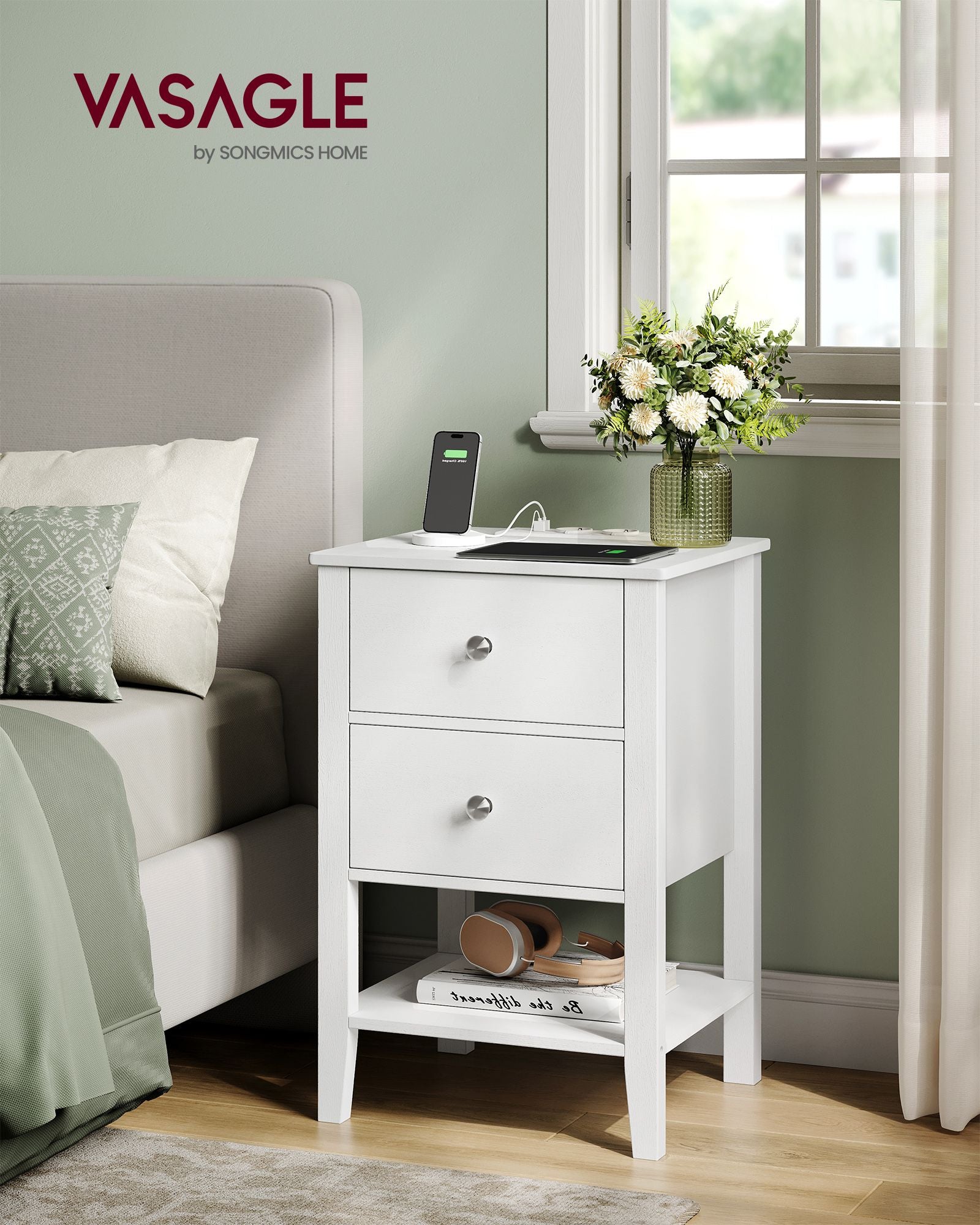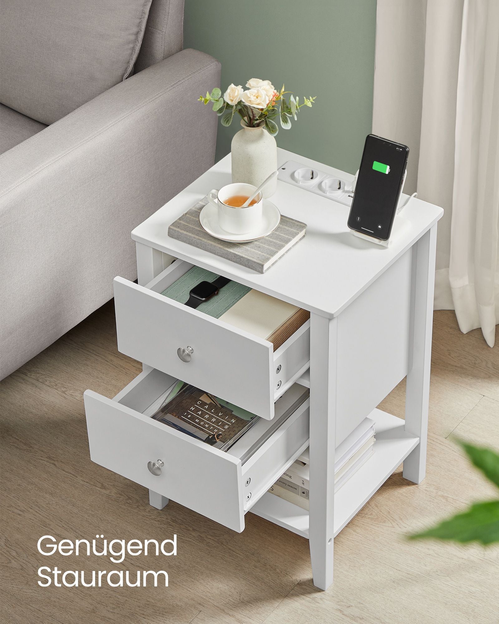 Bordet har 2 AC-udtag og 2 USB-porte, så du nemt kan oplade dine enheder. Med 2 skuffer og en åben hylde er der masser af opbevaringsplads til alle dine småting.