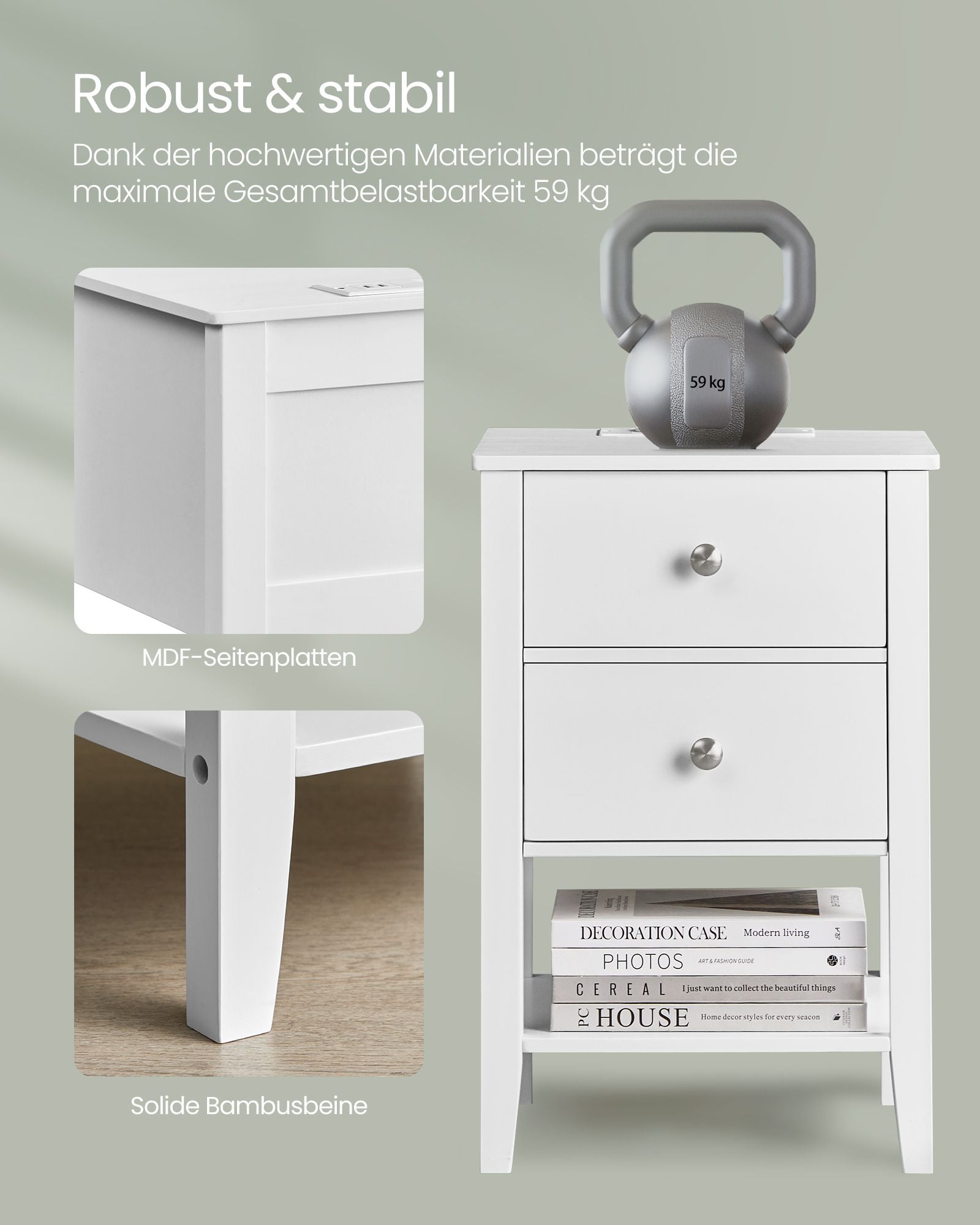 Dette senge- og sidebord i skyhvid med naturligt bambusdesign tilbyder både funktionalitet og holdbarhed. Perfekt til soveværelse eller stue og kan nemt integreres i enhver indretning.