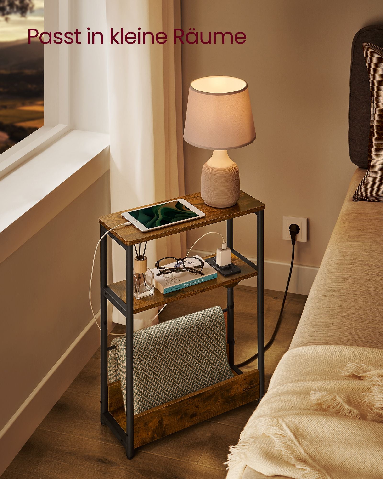 Med sin robuste stålramme og kvalitets spånplade kan dette sidebord bære op til 100 kg, hvilket sikrer stabil støtte til dine daglige behov. De tre hylder giver rigelig opbevaringsplads til magasiner, bøger og dagligdags genstande, hvilket gør det til et multifunktionelt møbel, der kan tilpasses til mange forskellige anvendelser. Uanset om du har brug for et magasinholder eller et bord til dine daglige ting, er dette natbord det perfekte valg.