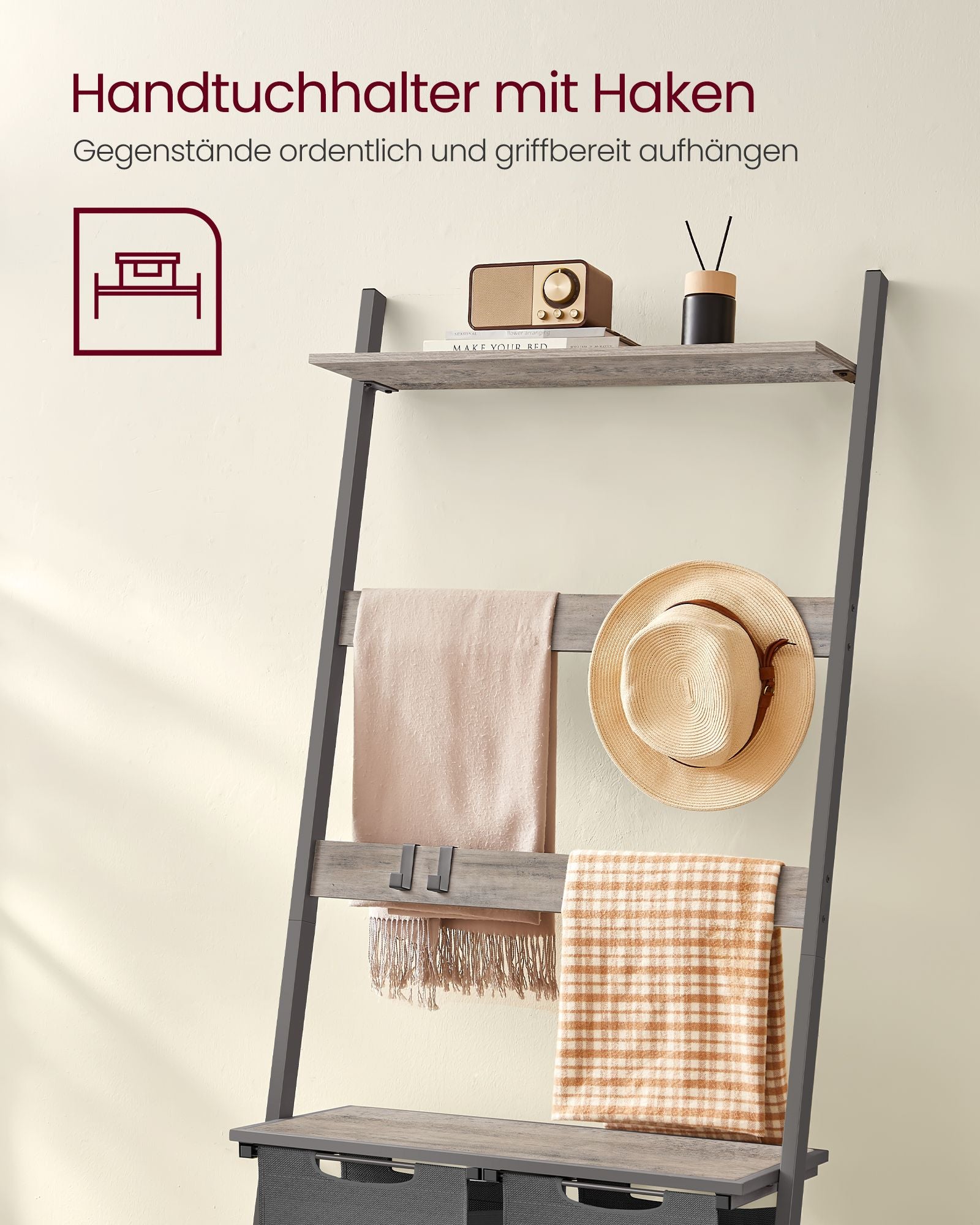 Den medfølgende håndklædeholder med 5 kroge er perfekt til at hænge håndklæder og tæpper. Den øverste hylde giver ekstra opbevaringsplads, hvilket gør det nemt at holde dit vaskerum organiseret og funktionelt.