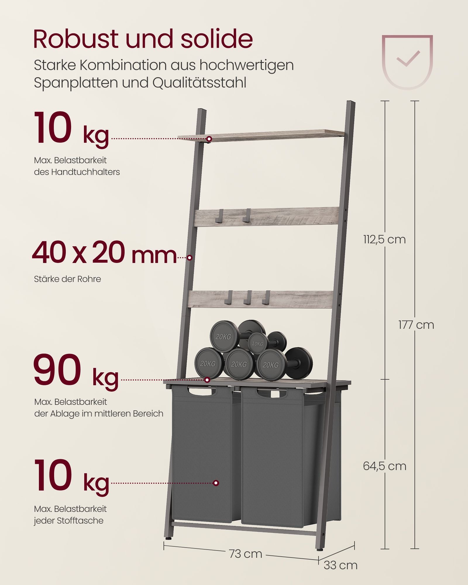 Vasketøjskurven er lavet af 20 mm stålrammer og 20 mm tykke partikelbrædder, hvilket sikrer, at den er både stabil og holdbar. Den kan bære op til 90 kg, og justerbare fødder holder den i balance, mens det medfølgende anti-tip kit giver ekstra stabilitet.