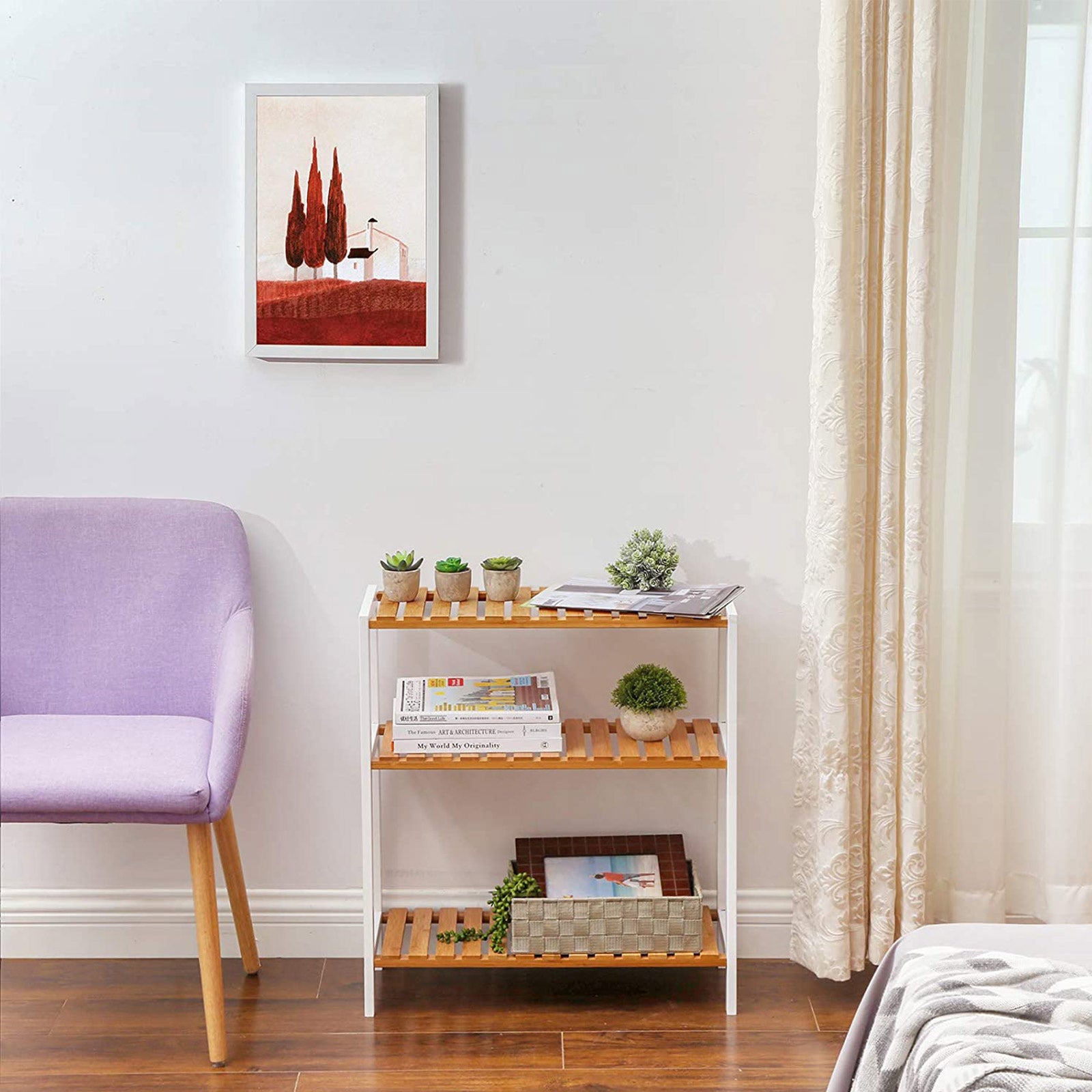 En 3-lags bambushylde, der tilføjer opbevaringsplads til dit værelse og samtidig tilfører et forfriskende touch.