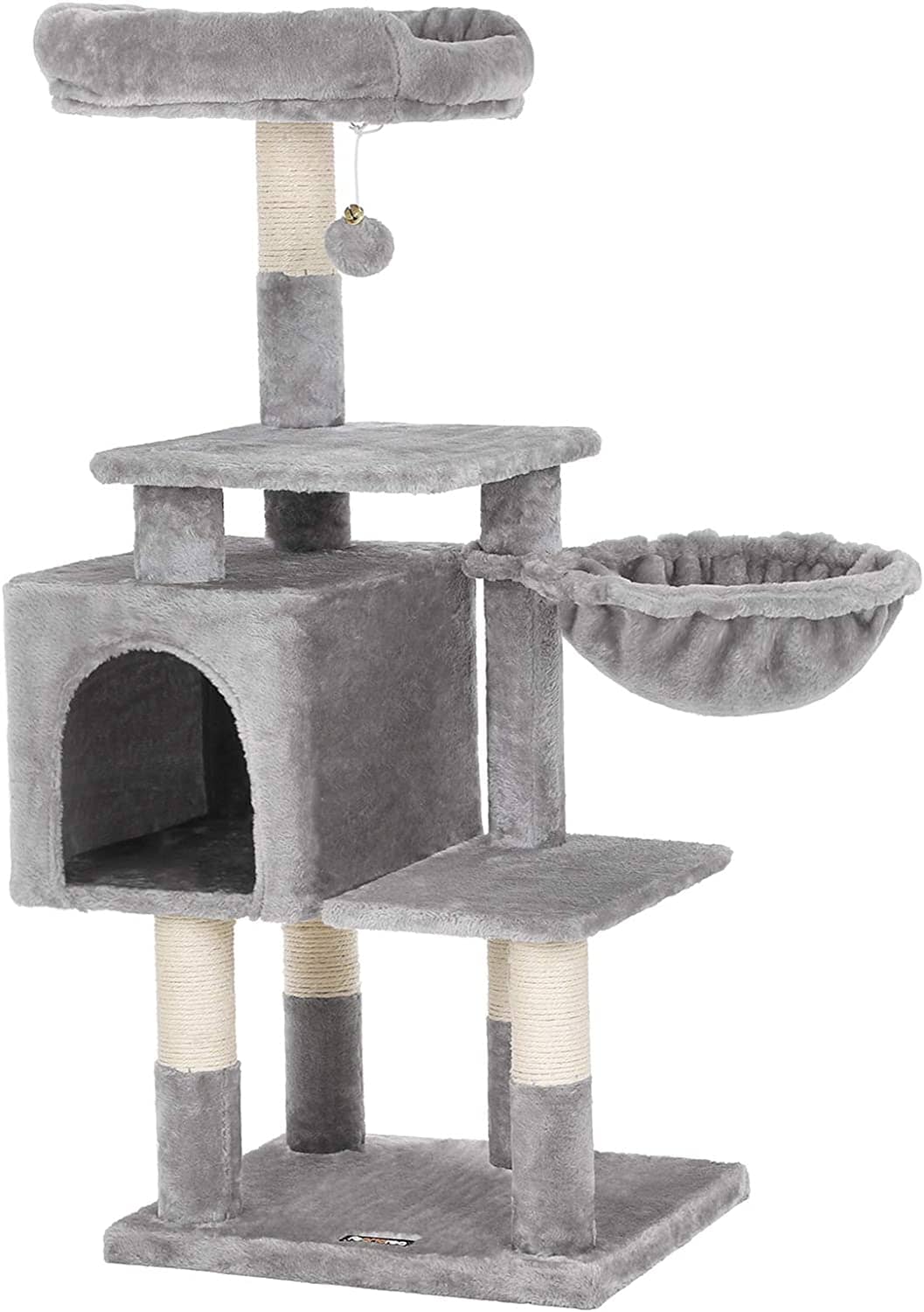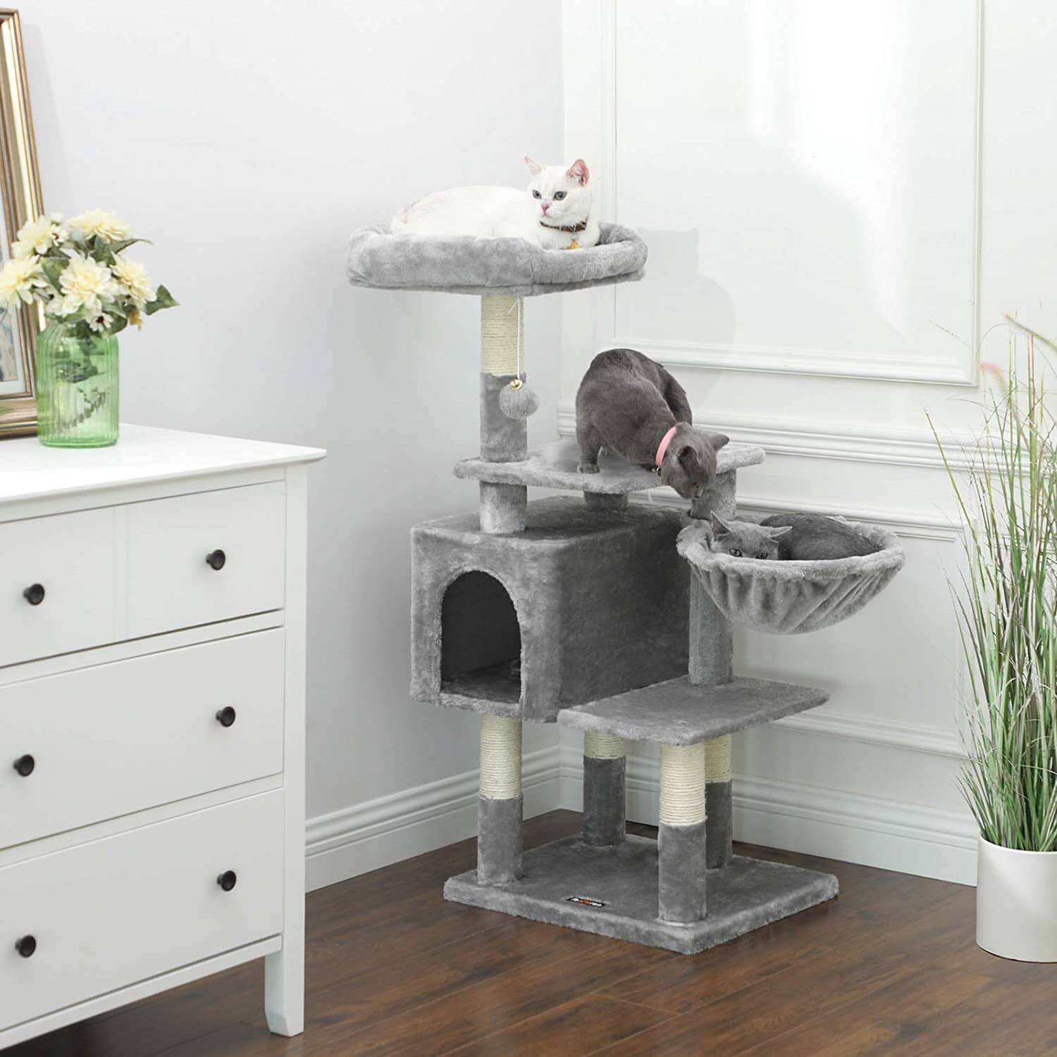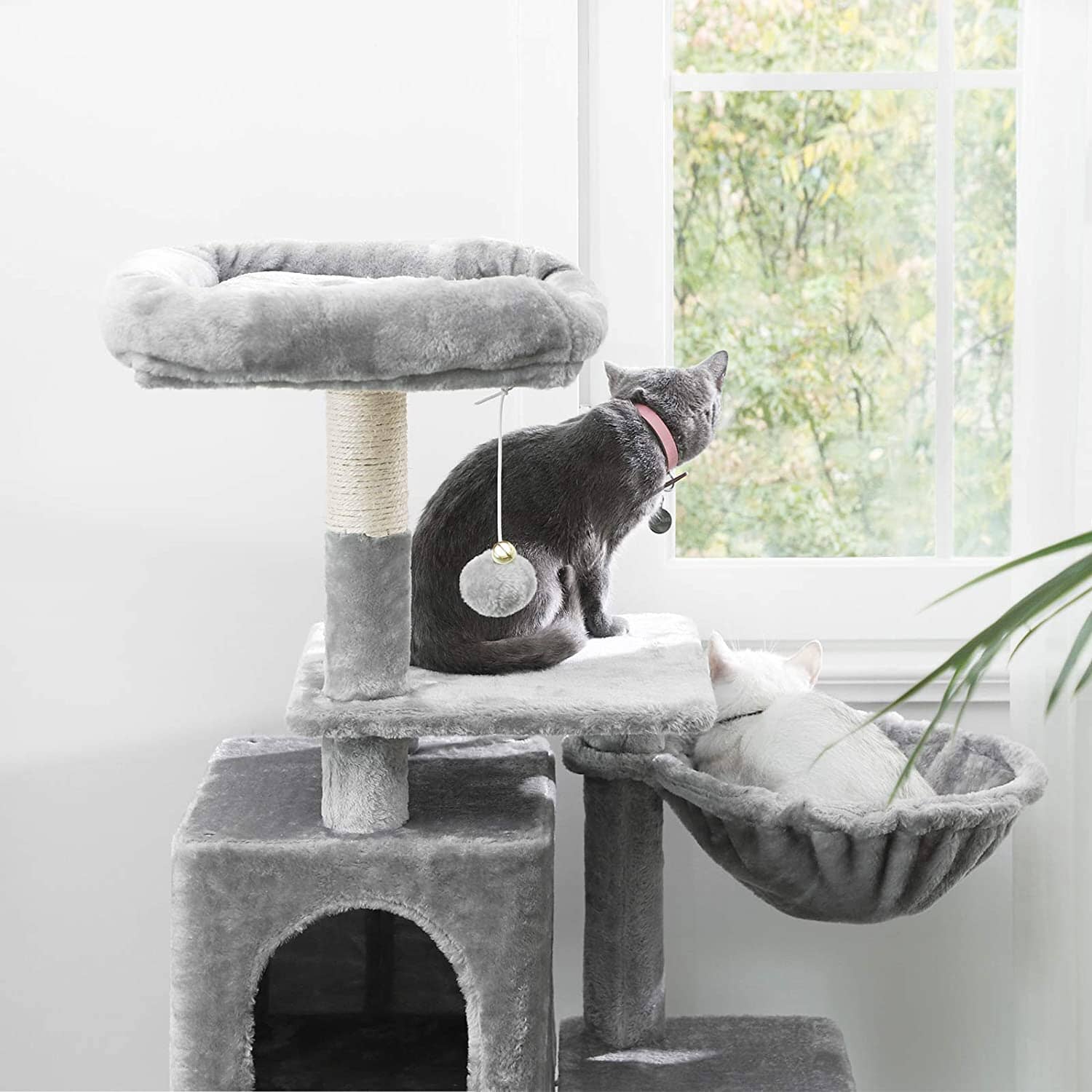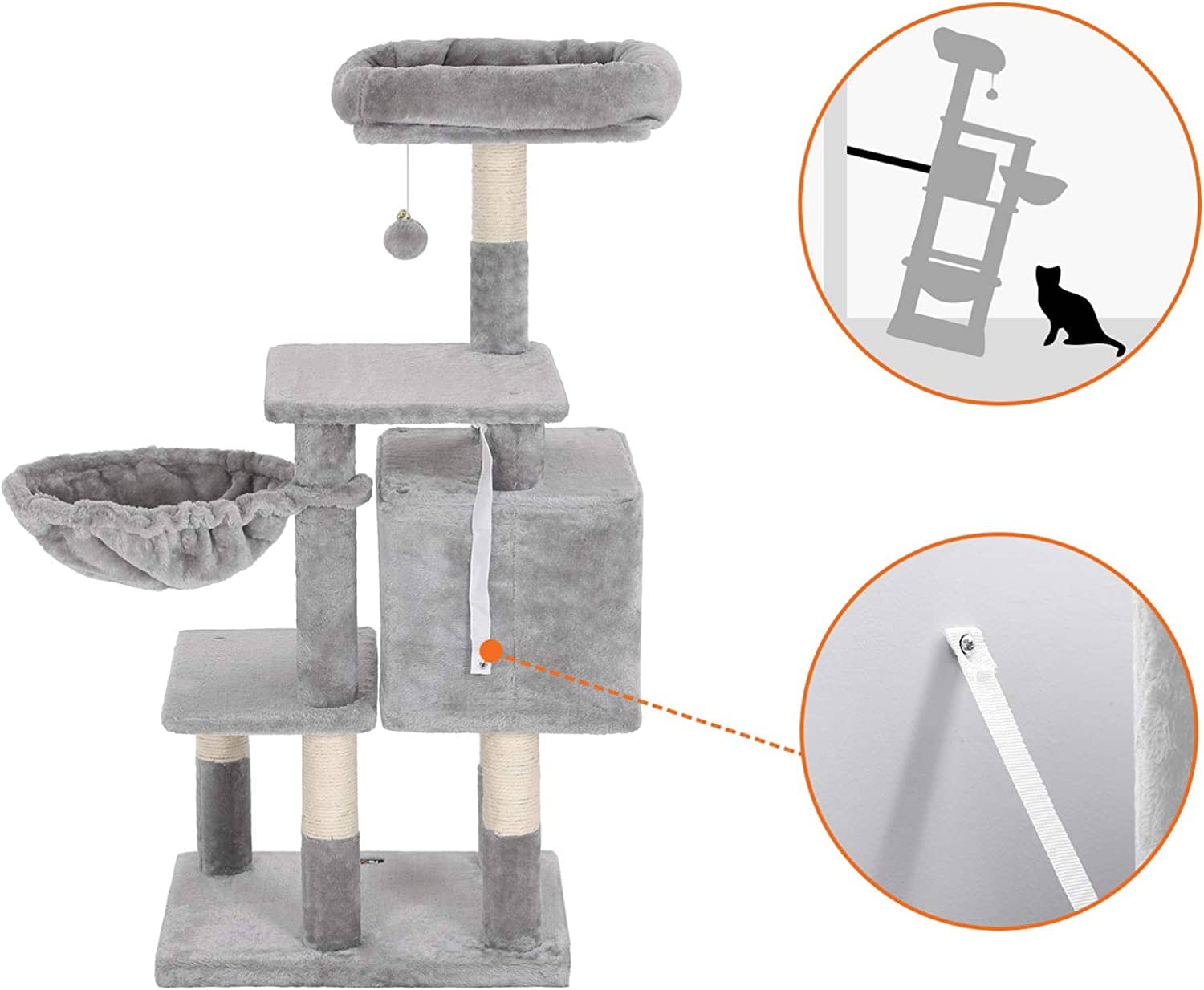 Flere niveauer til katte i flere aldre: Dette kattetræ er designet med flere niveauer, så det passer til både små killinger og ældre katte. Det har en rummelig øvre polstret siddepind, et legeområde på det nederste niveau, sisalstolper til træning af kløer, en liggestol og en privat hule til dine kattevenner.