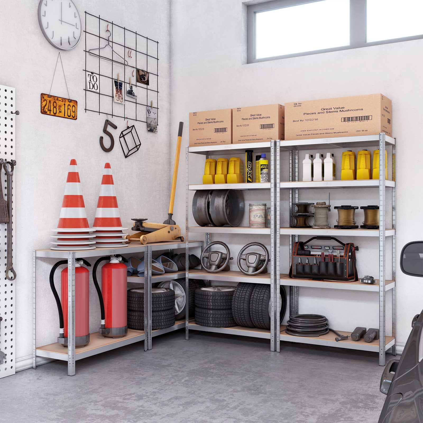 Kraftig og stabil: Vores garage reoler er designet til at klare selv de hårdeste opgaver! Med en stålramme og et anti-kip-sæt til vægforankring kan den holde op til 175 kg per hylde.