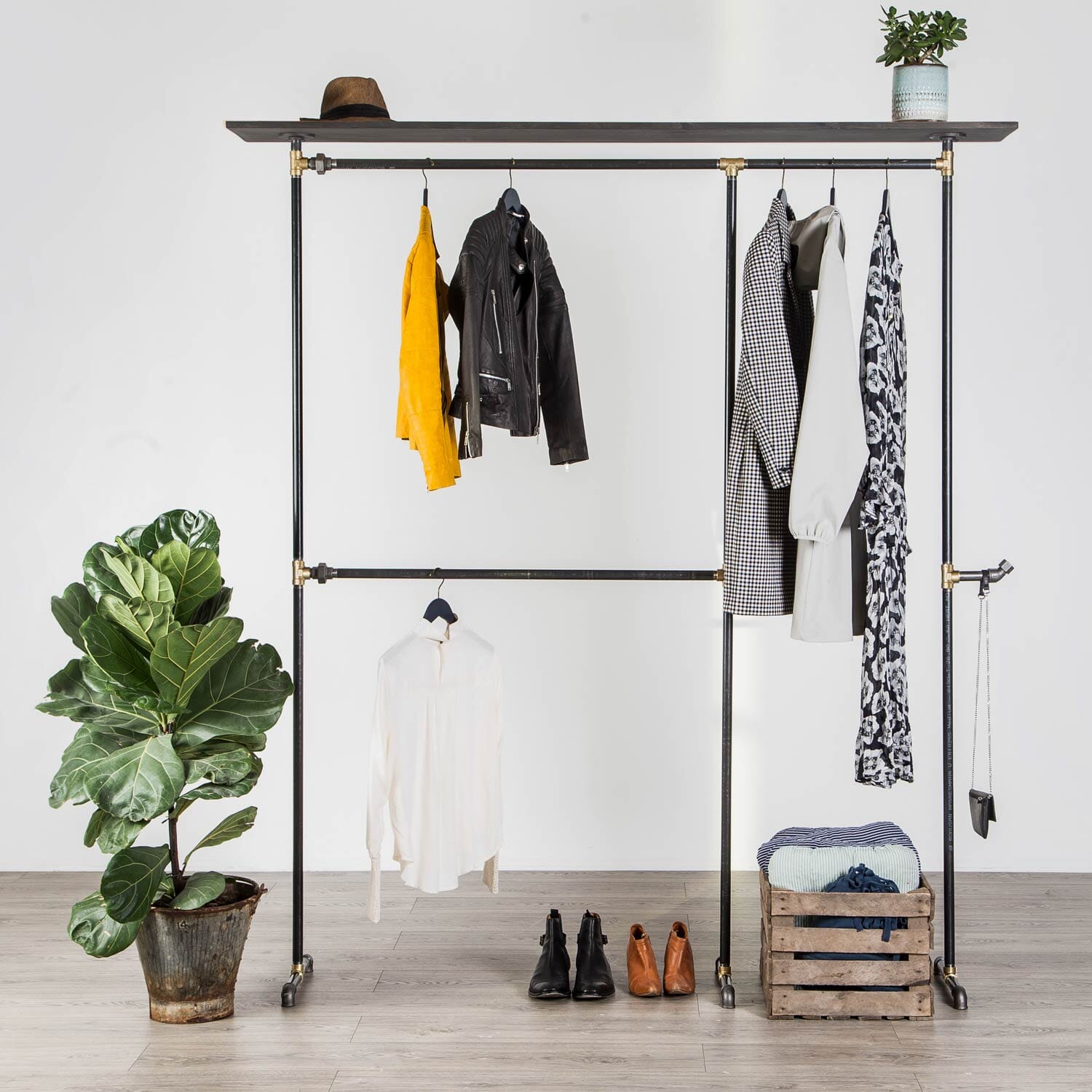 Tøjstativ ALMA i sort med messing er den ultimative opbevaringsløsning til både boliger og erhverv. Med en rørdiameter på 2,7 cm og en imponerende bæreevne på over 100 kilo, er dette tøjstativ skabt til at holde og imødekomme dine behov. Men der er mere end bare det - det inkluderer også en hylde i toppen til endnu mere praktisk opbevaring. Her er tre grunde til, hvorfor Tøjstativ ALMA er det ideelle valg:
