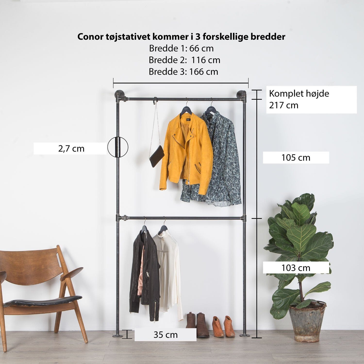 Vores Conor tøjstativ er bygget til at holde. Med en imponerende bæreevne på over 100 kilo kan du trygt hænge alle dine jakker, frakker, tasker og mere uden bekymring. Det er fremstillet af holdbare vandrør, der er kendt for deres robusthed og langvarige ydeevne. Dette tøjstativ er ikke kun en stilfuld tilføjelse til dit hjem, men også en pålidelig partner til opbevaring af dit tøj.