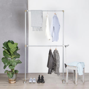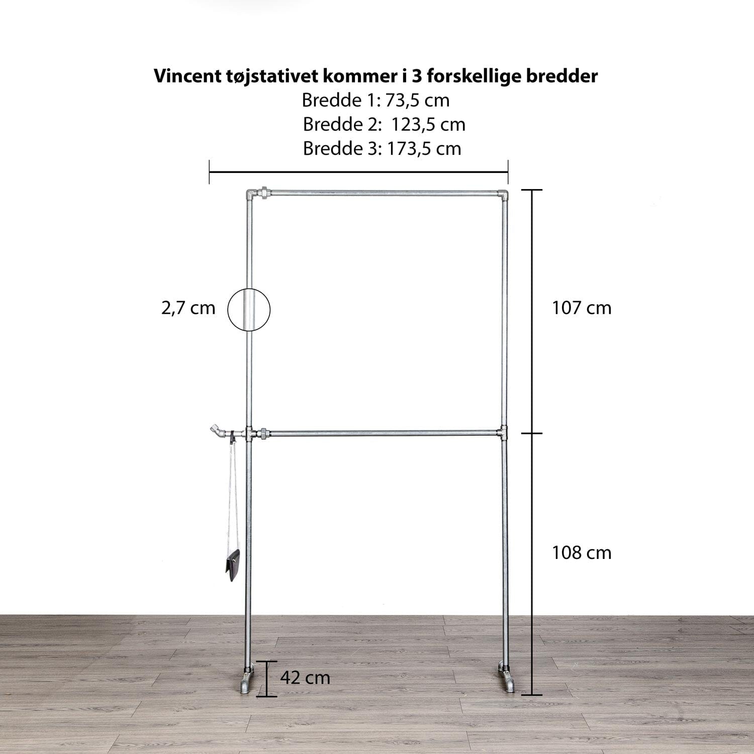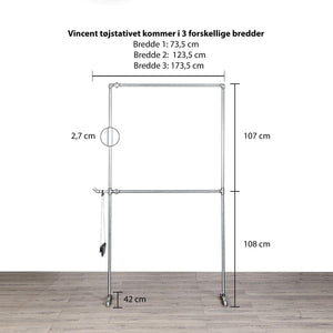 Vincent er et dobbelt tøjstativ i et enkelt design, som passer ind i alle indretninger. De to bøjlestænger gør dette stativ til super pladsbesparende stativ, der passer perfekt til dig der gerne vil udnytte højden i rummet rigtigt. I bunden er der plads til stille dine sko, tasker eller lignende opbevaring.