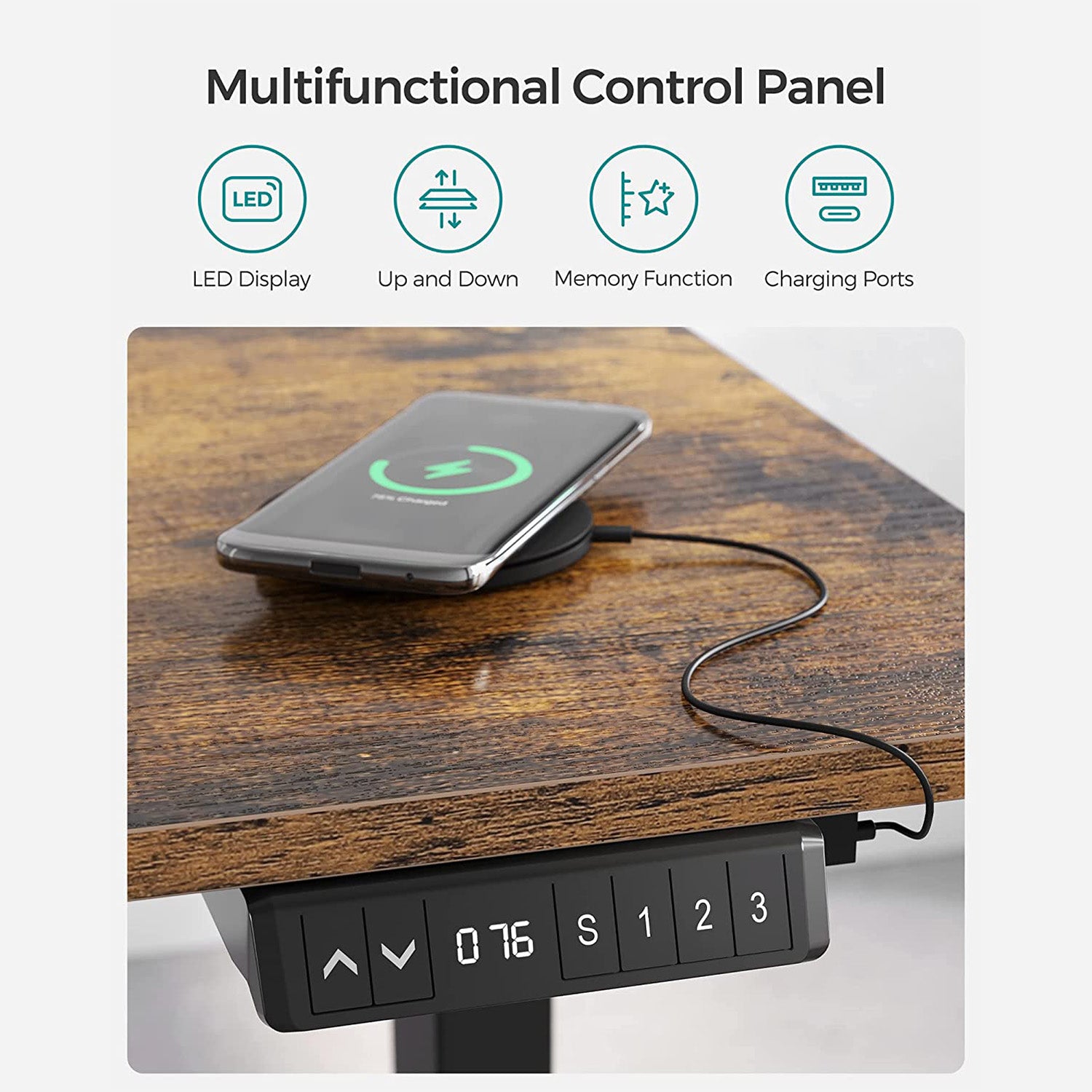 Skrivebordets stel leveres med en række moderne funktioner for at forbedre din arbejdsoplevelse. Med indbyggede knapper kan du gemme tre forskellige højder, hvilket gør det hurtigt at tilpasse din arbejdsstilling. USB- og TYPE-C-porte giver mulighed for opladning af dine enheder direkte fra stellet. For sikkerhedens skyld stopper og trækker stellet sig let tilbage, hvis det rammer en hindring under justering. Den højkvalitets motor sikrer en støjsvag og glidende justering med en hastighed på 25 mm/s og et lavt støjniveau (<50 dB), så du kan arbejde uforstyrret.