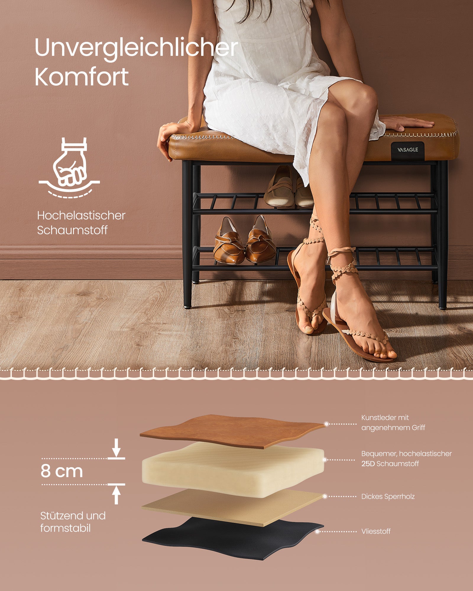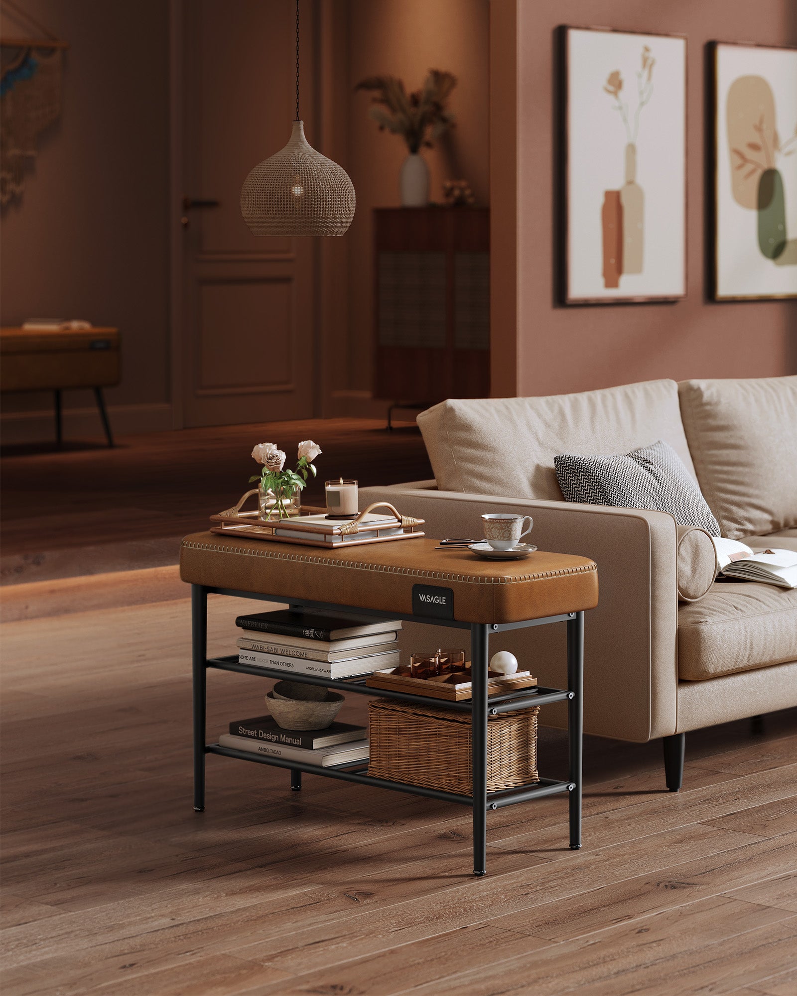 Dette senge- og sidebord er ikke kun designet med komfort for øje, men også med holdbarhed og funktionalitet. Med en robust stålramme og universelle justerbare ben kan bordet bære op til 135 kg uden problemer. Den solide konstruktion sikrer, at bordet er stabilt, uanset hvor du placerer det. De tre opbevaringshylder under bænken giver rigelig plads til sko, og der er endda nok plads under hylderne til en robotstøvsuger, så du kan holde dit hjem rent og ryddeligt.