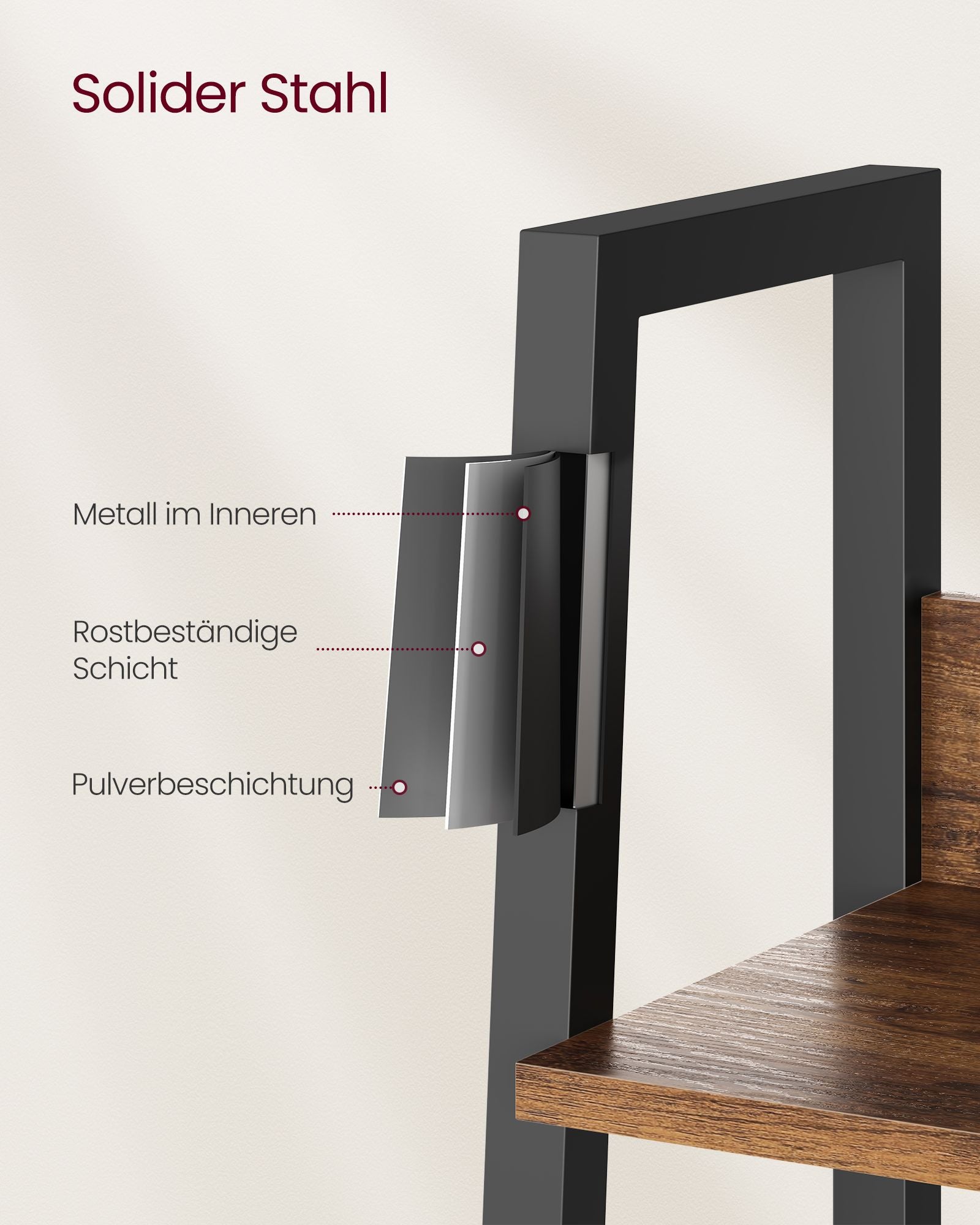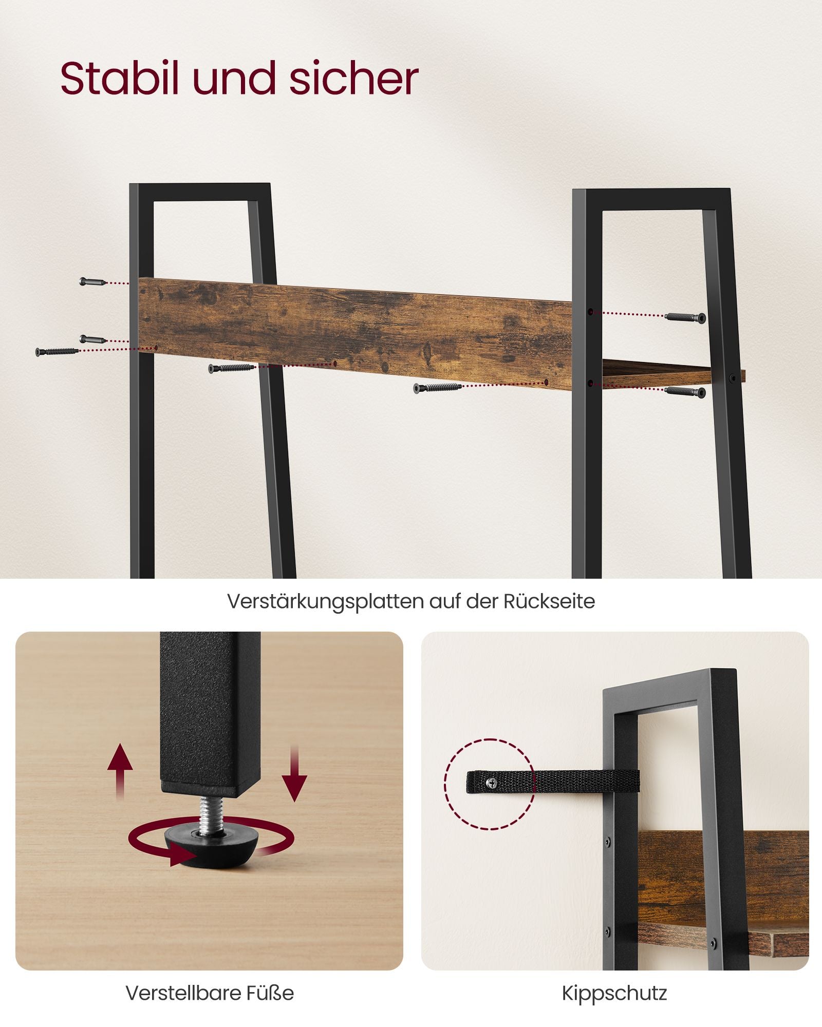 For at sikre, at din reol står stabilt, er den udstyret med bagpaneler af spånplade og stålstænger på siderne, der giver en solid ramme. Justerbare fødder sikrer, at reolen står stabilt, selv på ujævnt underlag. Den robuste konstruktion af stål og høj kvalitet spånplade gør, at denne reol kan bære op til 75 kg i alt, hvilket betyder, at du kan opbevare dine bøger og samlinger med ro i sindet.