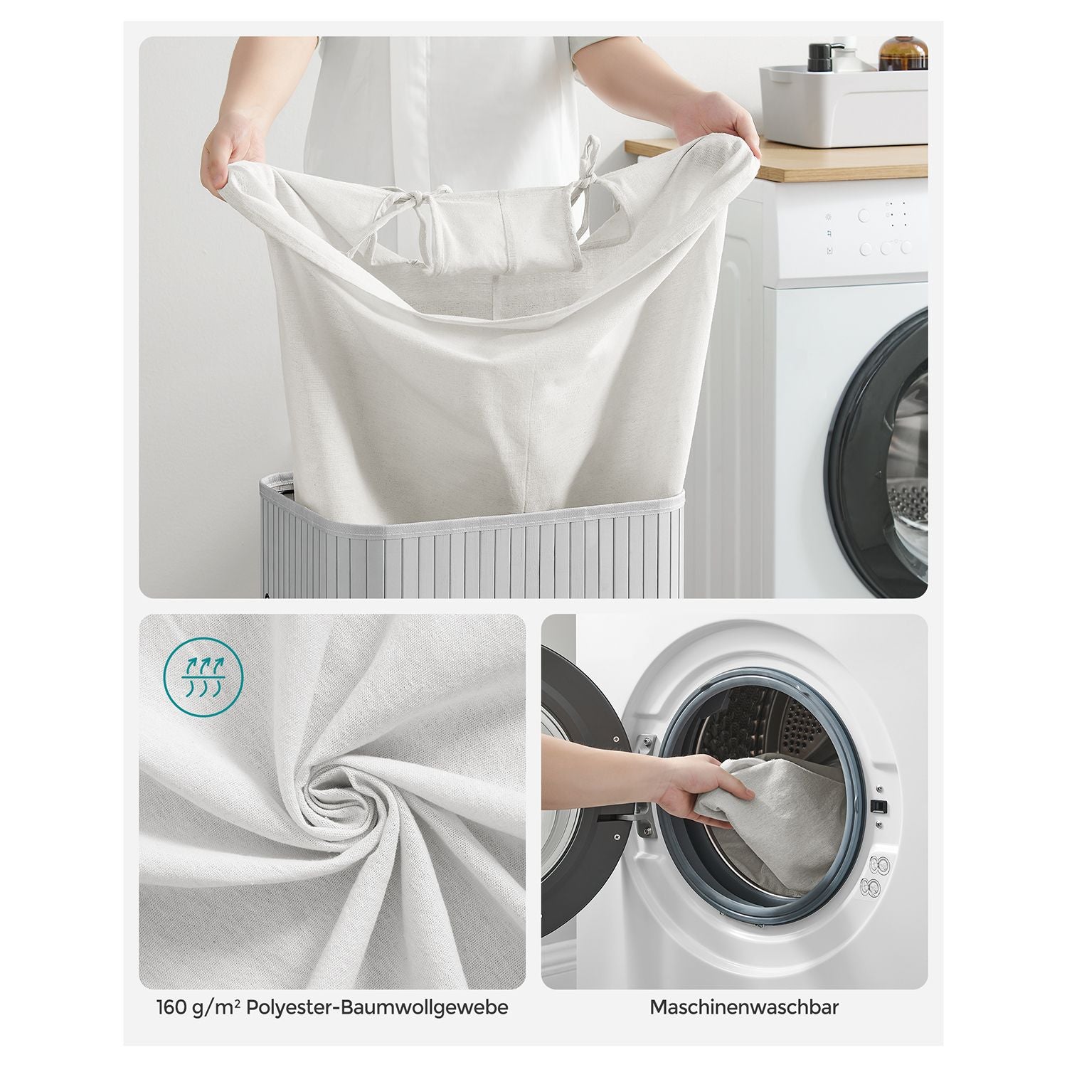 Den indre vasketøjspose er lavet af 160 g/m² bomuldsstof og er aftagelig, så du nemt kan tage den med til vaskemaskinen. Denne praktiske funktion gør det enkelt at holde din vasketøjskurv ren og frisk, uden besvær.